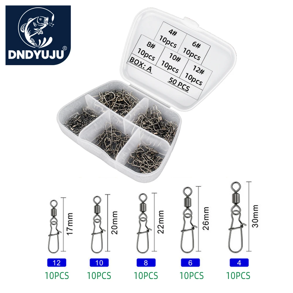 DNDYUJU 50pcs Stainless Steel Fishing Connector Pin Bearing Rolling Swivel Snap in Box Fishing Tackle Accessories For Lure Hook