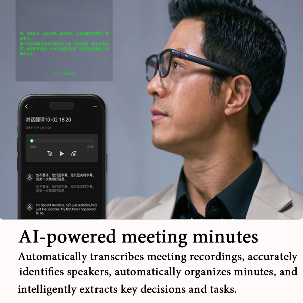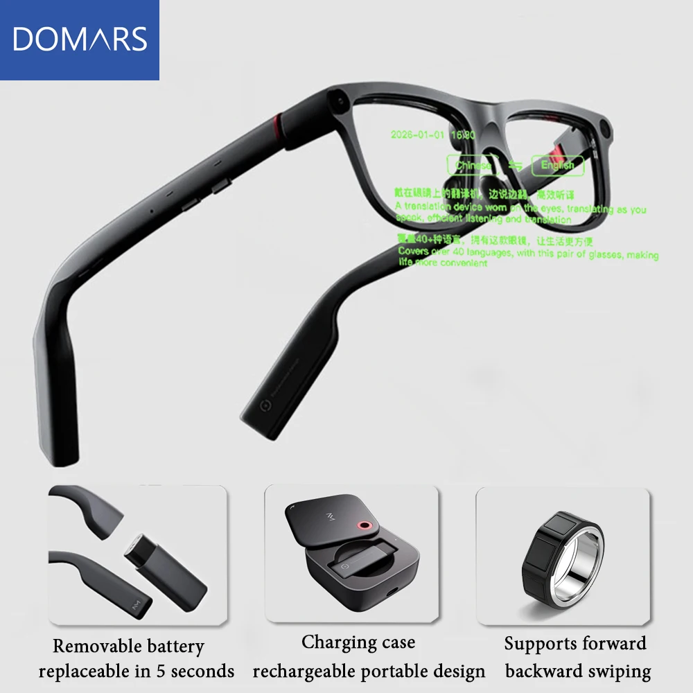 4.(AI Meeting Conference Recording Automatic Creation & Hands-free High-Precision Recording Function) Domars smart glasses are equipped with AI for high-precision recording and transcription features, and automatic extraction of key contents, allowing you to automatically convert them to summarize meetings, record for long periods of recording, linking with meeting tools, and accurate texting. These smart glasses also allow you to distinguish multiple speakers for clear recording. In addition to face-to-face meetings, you can also capture voice from online meetings and conference phone calls directly within your device. This eliminates the inefficient and overlooked writing notes and reduces the burden of making announcements. Significantly improve knowledge management efficiency for business persons, students and journalists.