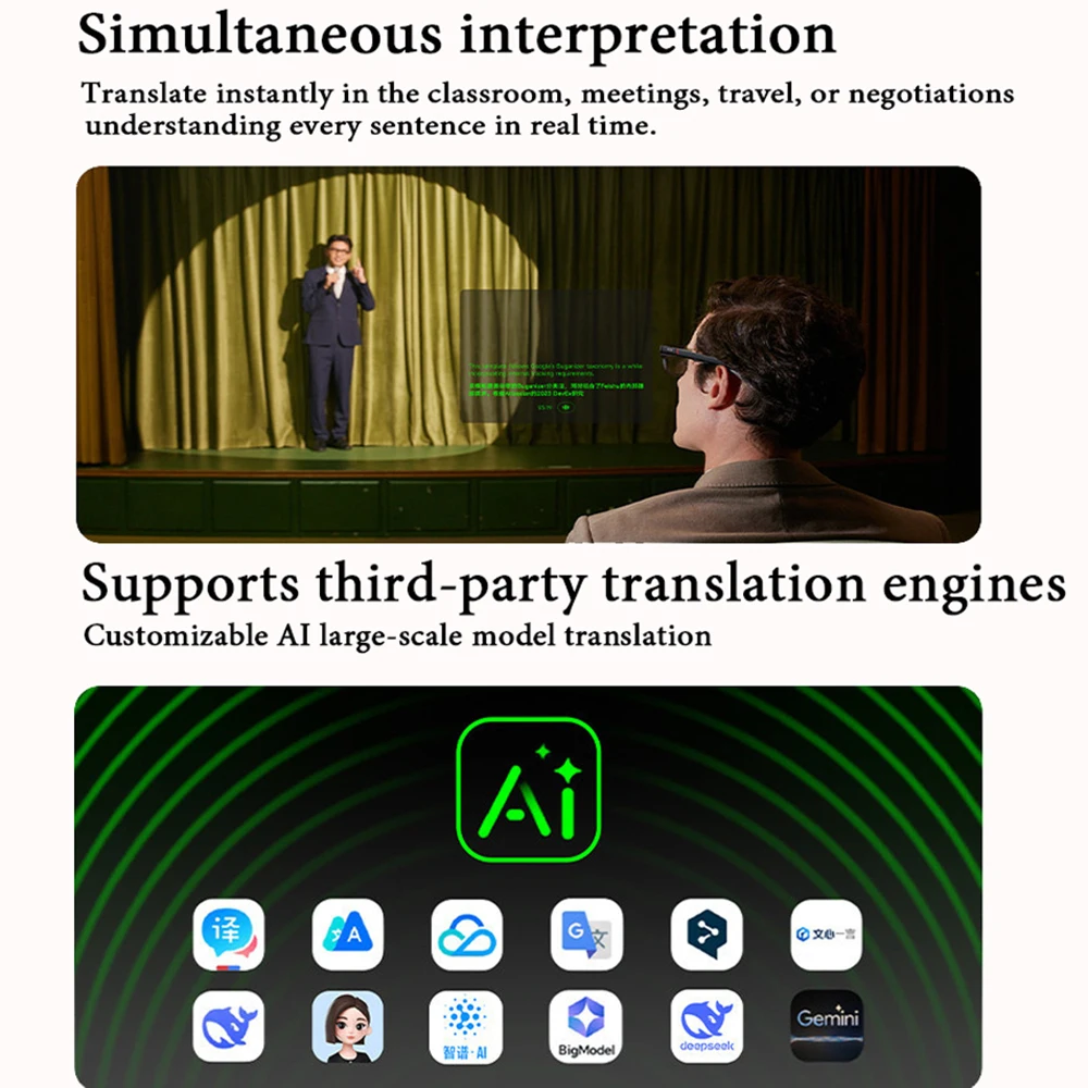 1.Smart Glass & Real Time AI Subtitles: Domars Smart Glass uses uniquely developed streaming interpretation technology and large language model technology, so there is no need to take out your smartphone, so you can instantly display the conversation translations on the display in front of you. Domars subtitles glasses help people with hearing impaired, business negotiations and the international association prevent information from spilling out. You can also smoothly proceed with overseas trade negotiations, international conferences, and academic lectures. 【Smart Glass with Smart Segmentation Technology】 Real-time context recognition and optimize translation It clearly displays the meaning of a batch so it is easy to read even in long sentences.