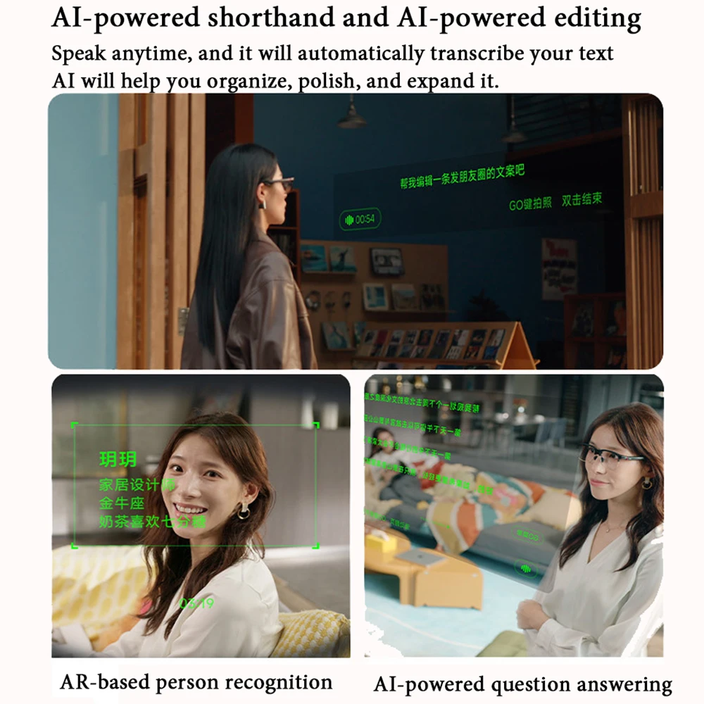 5.(AI Interaction Support, AI Assistant & Brush Up Text by AI Point1 Assistance: Use the camera to analyze the expressions and reactions of the person in a conversation and predict the information needed for a conversation. Point 2 instantly translates your statement and automatically edits suggestions into a more professional and sophisticated expression in business or formal settings. Point 3: Use this smart glass to activate information, answer questions, and create ideas