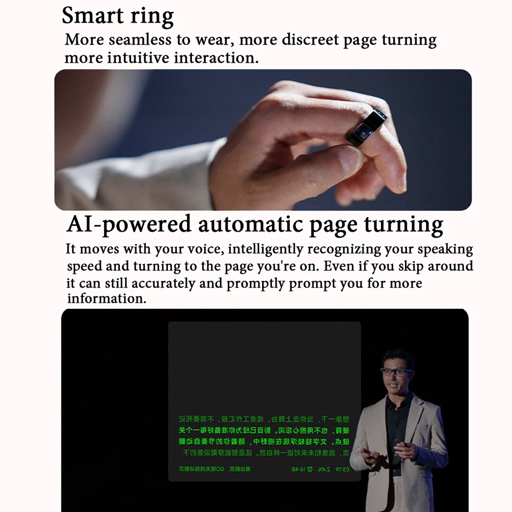 Ring main functions: AI automatic page turning. It moves with your voice, intelligently recognizing your speaking speed; it turns the page to where you are speaking. Even if you skip around, it can still accurately prompt you with words.