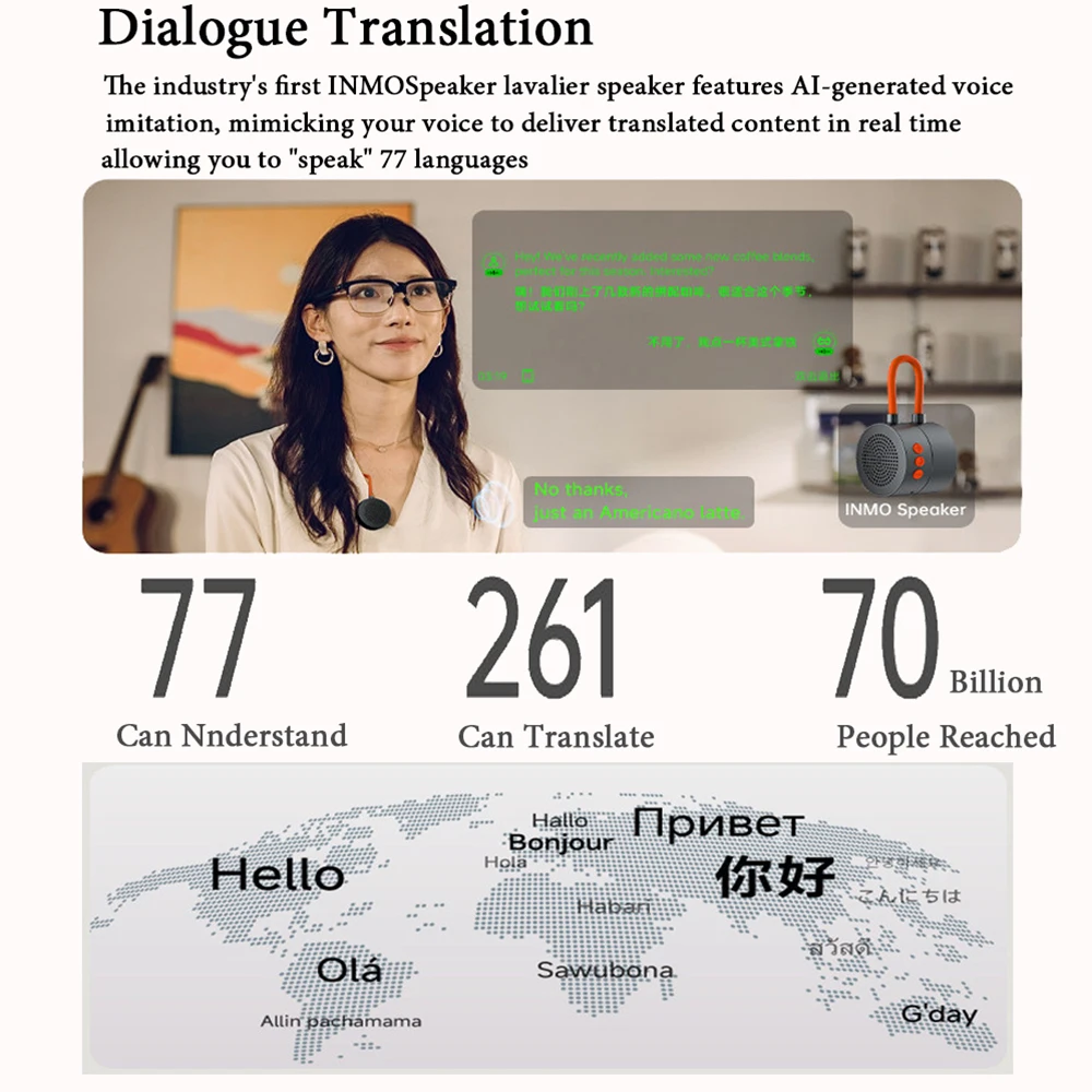 Lavalier speaker: The industry’s first INMO Speaker lavalier speaker, featuring AI voice mimicry, replicates your voice, and provides real-time translated content, allowing you to “speak” 77 languages.