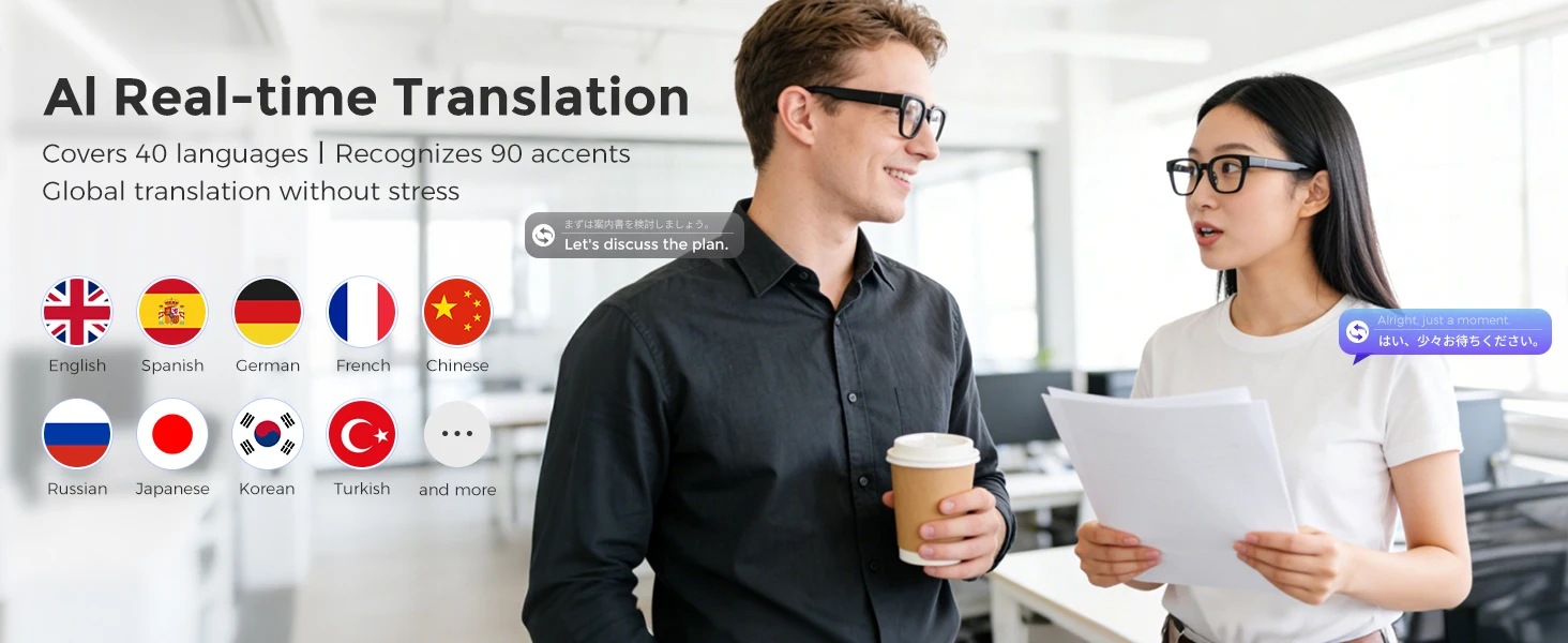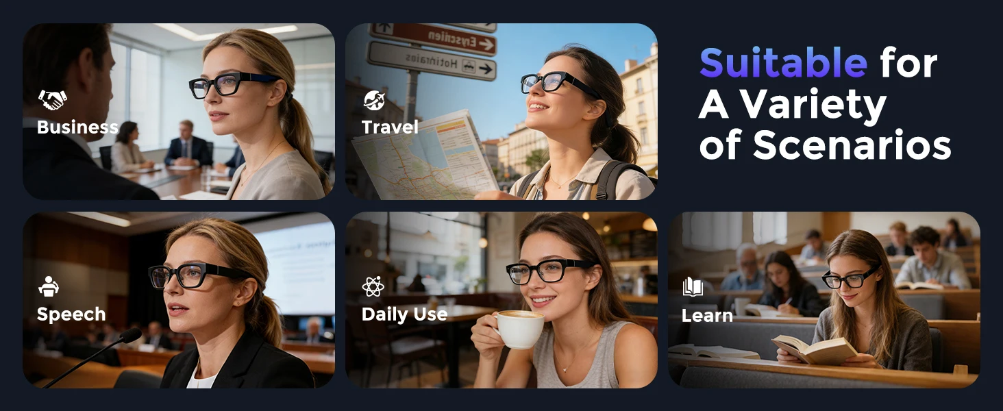 【AI Translation Glasses for Global Travel & Business】These smart glasses for men and women deliver instant translation in multiple languages, powered by third-generation enhanced translation technology for smoother, more accurate communication during international travel, business meetings, trade shows, and study abroad. As translation glasses for men and women, they offer a seamless hands-free experience ideal for multilingual environments.