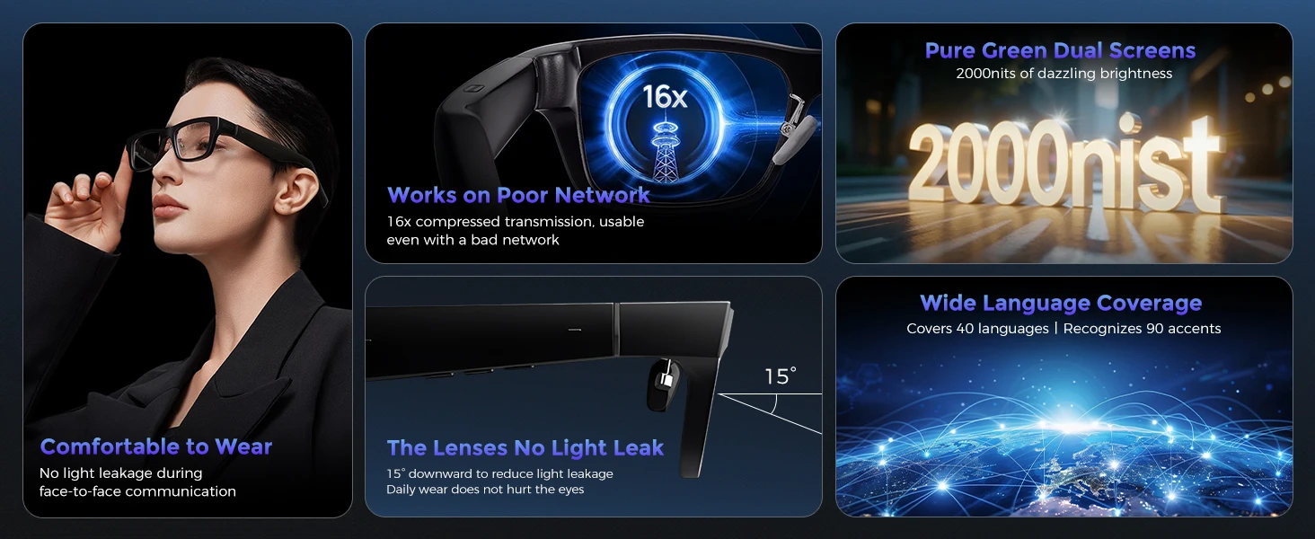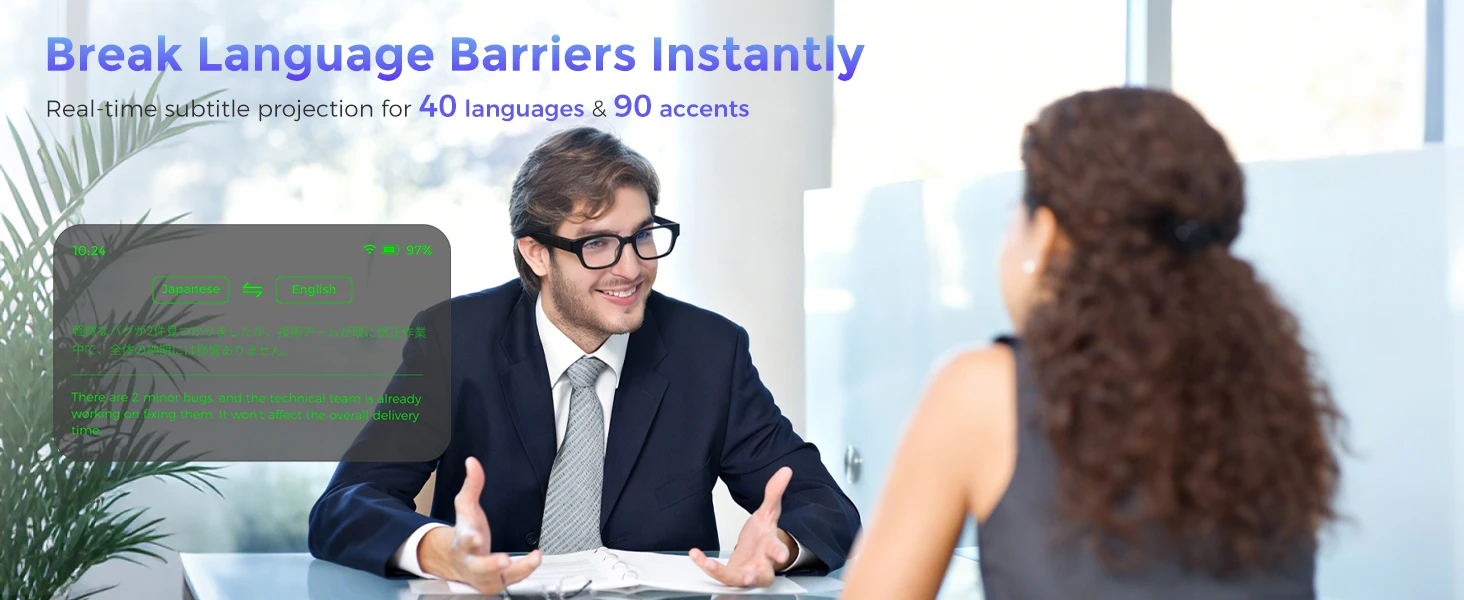 【AR Display for Clear, Hands-Free Prompts & Communication】The dual-lens AR smart glasses display translations, cues, and prompts across both lenses simultaneously, keeping your focus on the conversation with better balance and readability. Perfect for negotiations, lectures, presentations, and daily communication without needing to check your phone.