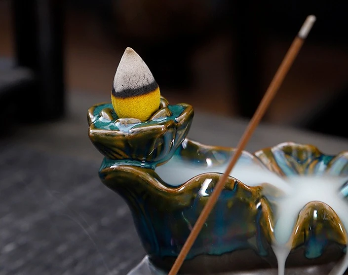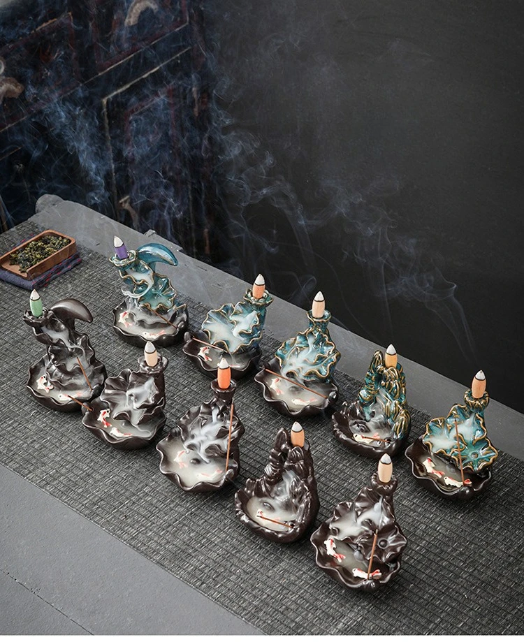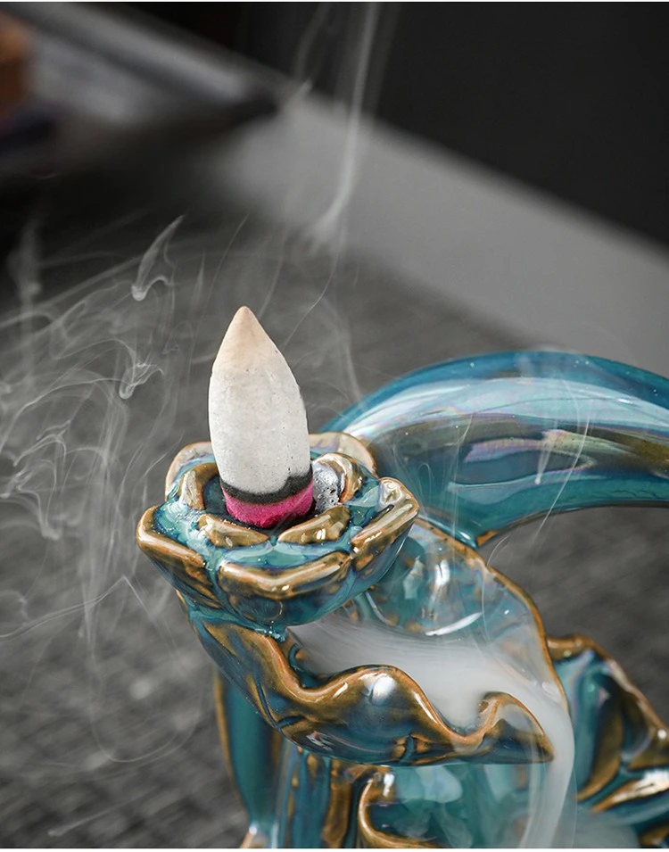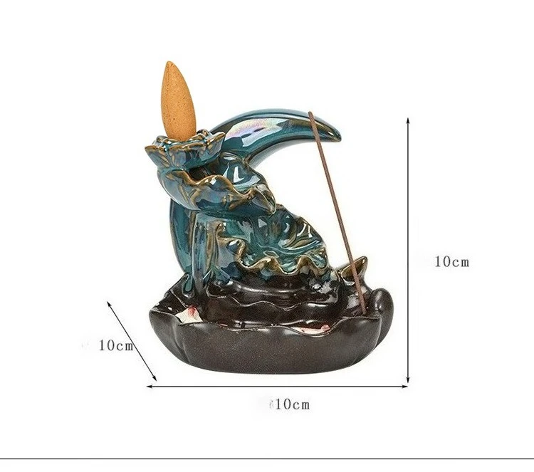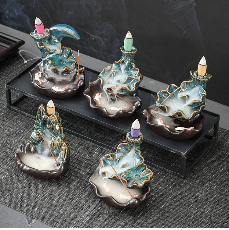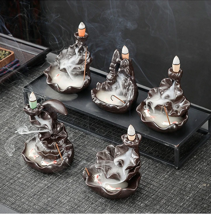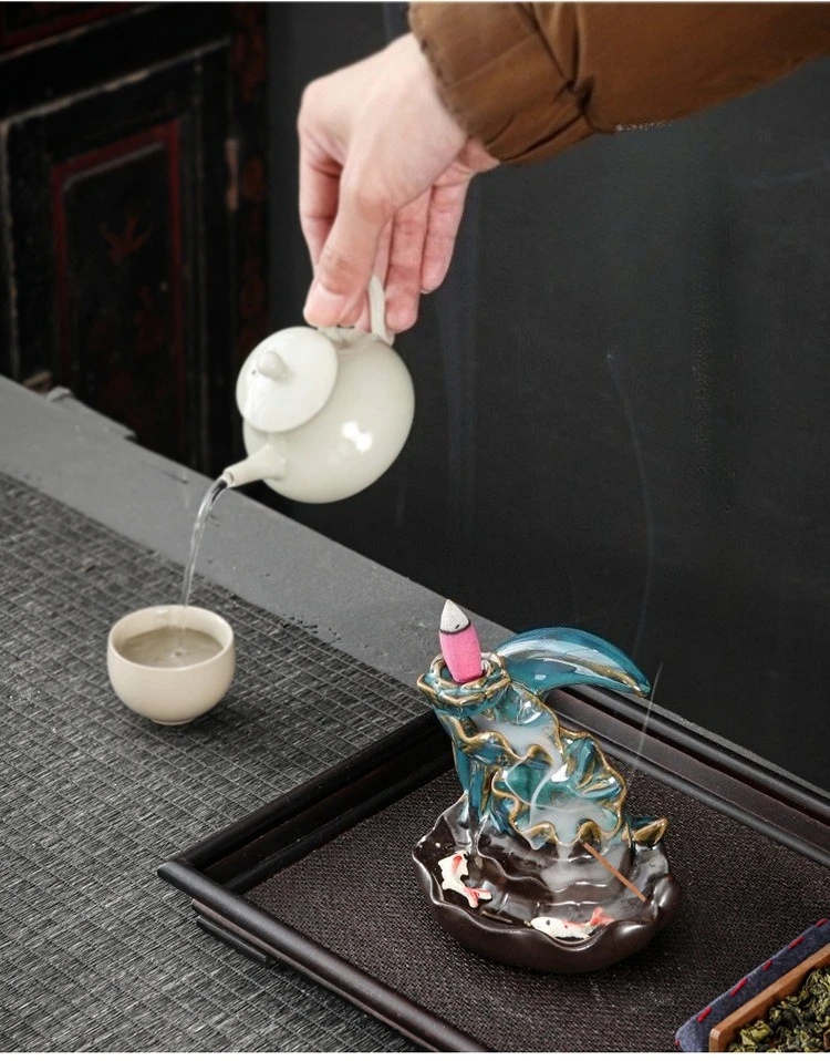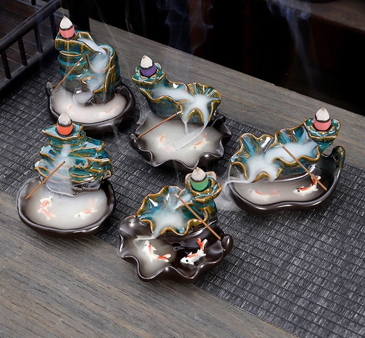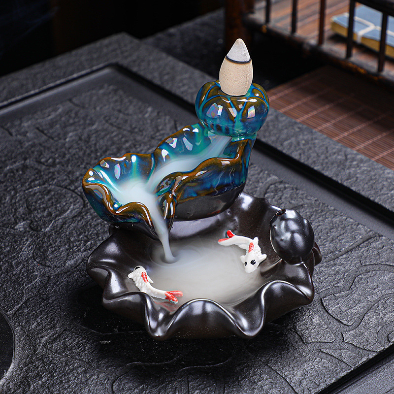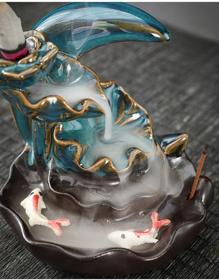 Double Fish Flowing Back Incense Burner Creative Home Decor Waterfall Incense Ceramic Furnace Craft Lotus Incense Burner
