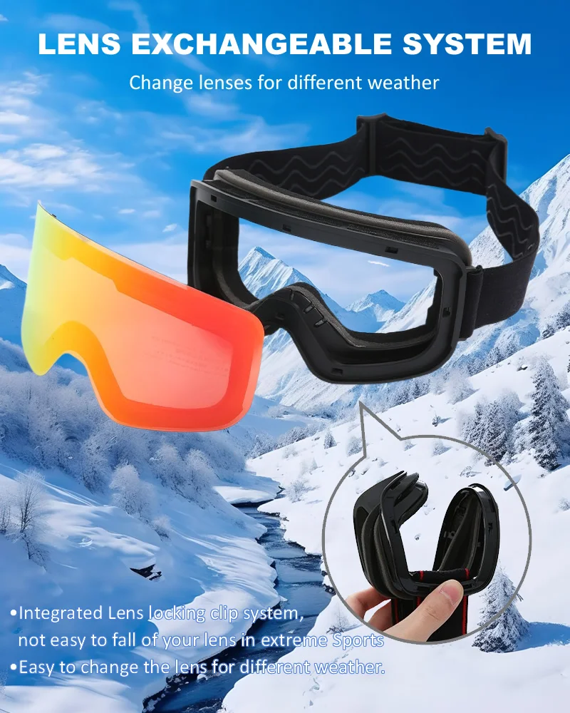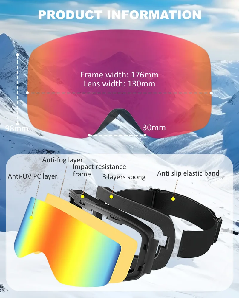 【Elastic Strap & Adjustable Buckle】These skiing goggles to stay well on the ski helmet. And fully adjustable buckle strap double guarantees the goggle will not slide off even in the most extreme ride. High density woven strap with great elastic and superior sponge covers your face and gives you a snug fit, you would feel no impression on your face and not tightand.