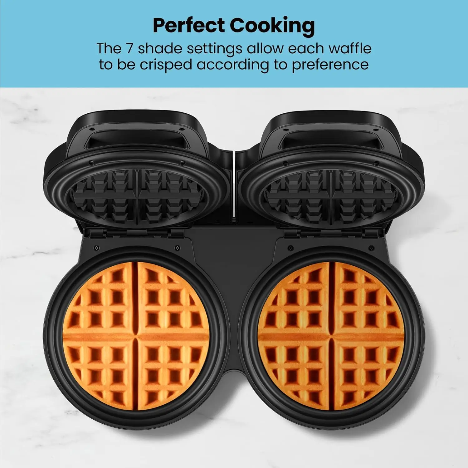 - PERFECT TIMING: Our waffle machine is preset with 7 shade settings so you can customize your waffle with perfect amount of crunch. Ready indicator lights let you know when cooking is complete for a beautifully browned waffle.