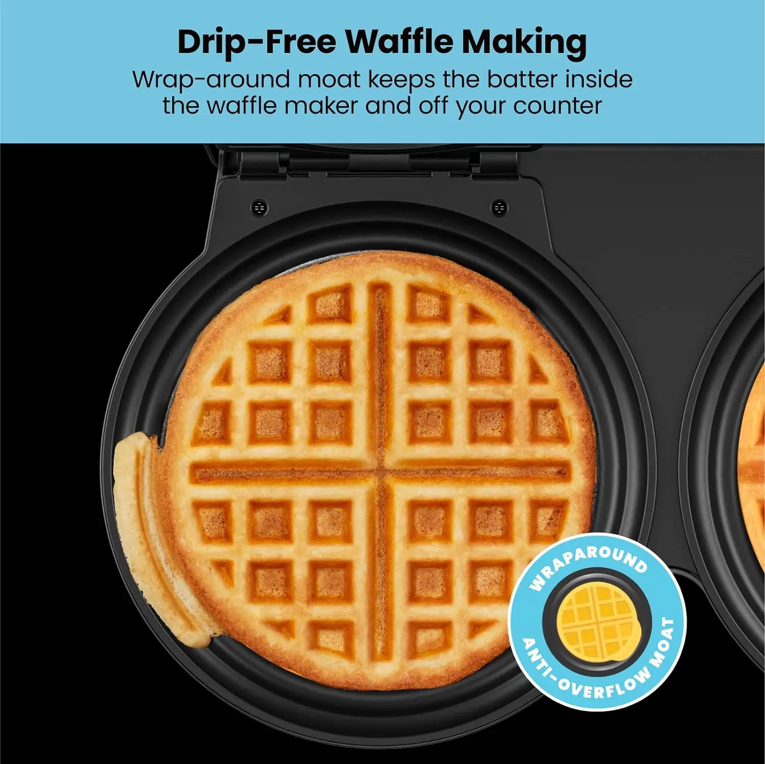 - MESS-FREE: Get gourmet breakfast you crave without added hassle and mess. Our uniquely designed anti-overflow moat allows for fluffy mouthwatering waffles without time-consuming clean-up.