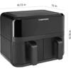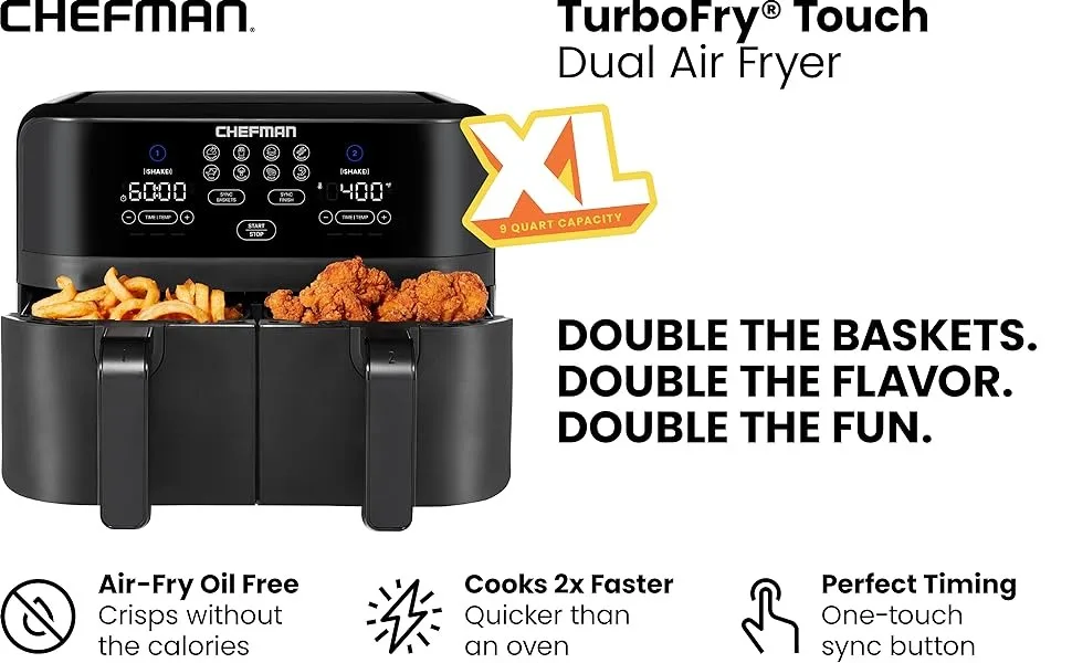 - DOUBLE THE DISHES: Air frying the healthiest, crispiest, and most flavorful food for the entire family has never been so convenient. The TurboFry Touch Dual Air Fryer has two spacious, 4.5-quart baskets so you can maximize and master mealtime. Chefman makes cooking crowd-worthy meals even easier with synced baskets and an intuitive finish-time feature.
