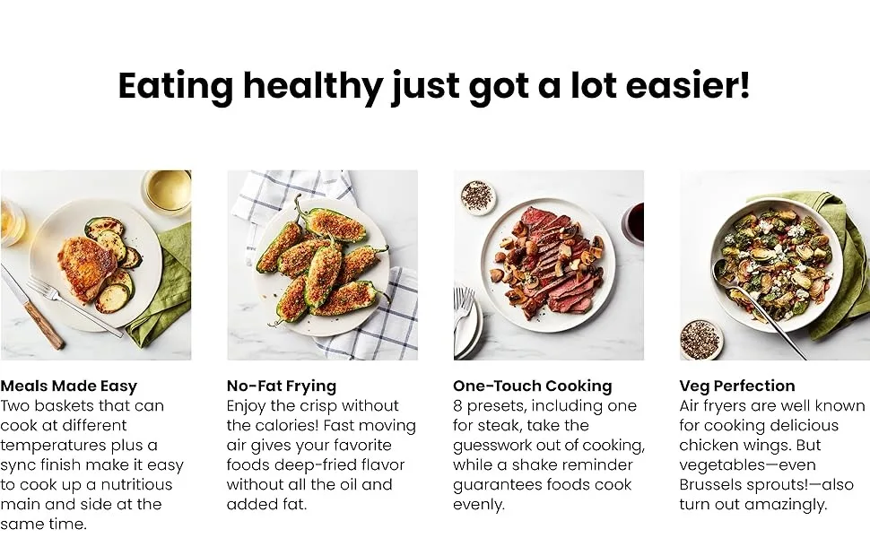 - CARE-FREE CLEANUP: This air fryer is the full package—spacious and incredibly sleek. The matte black exterior displays beautifully on your countertop, but is also extremely simple to stow away. When you’re done cooking your dish, wipe down the exterior with a damp cloth. All accessories are dishwasher-safe, and the nonstick baskets are incredibly easy to clean.