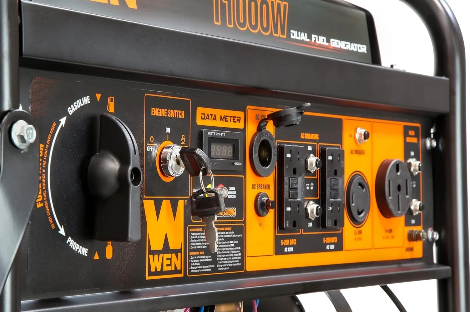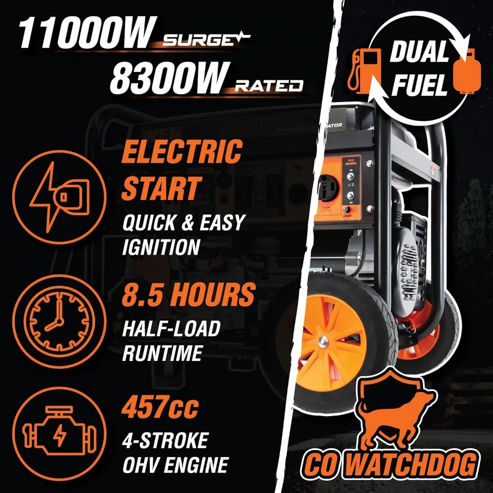 • Switch between gasoline (11,000 surge watts, 8,300 running watt) and propane (9,500 surge, 7,500 running) with the simple turn of the selection dial