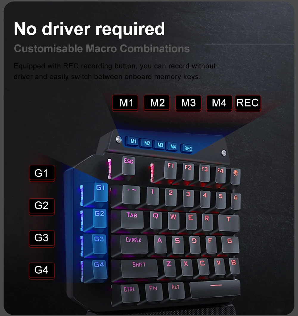 ❤ 6 Onboard Macro Keys ▶ Assign complex in-game macros to G1,G2,G3,G4,~,T 6 keys Onboard without Drivers, and total 4 groups M1, M2, M3, M4.
