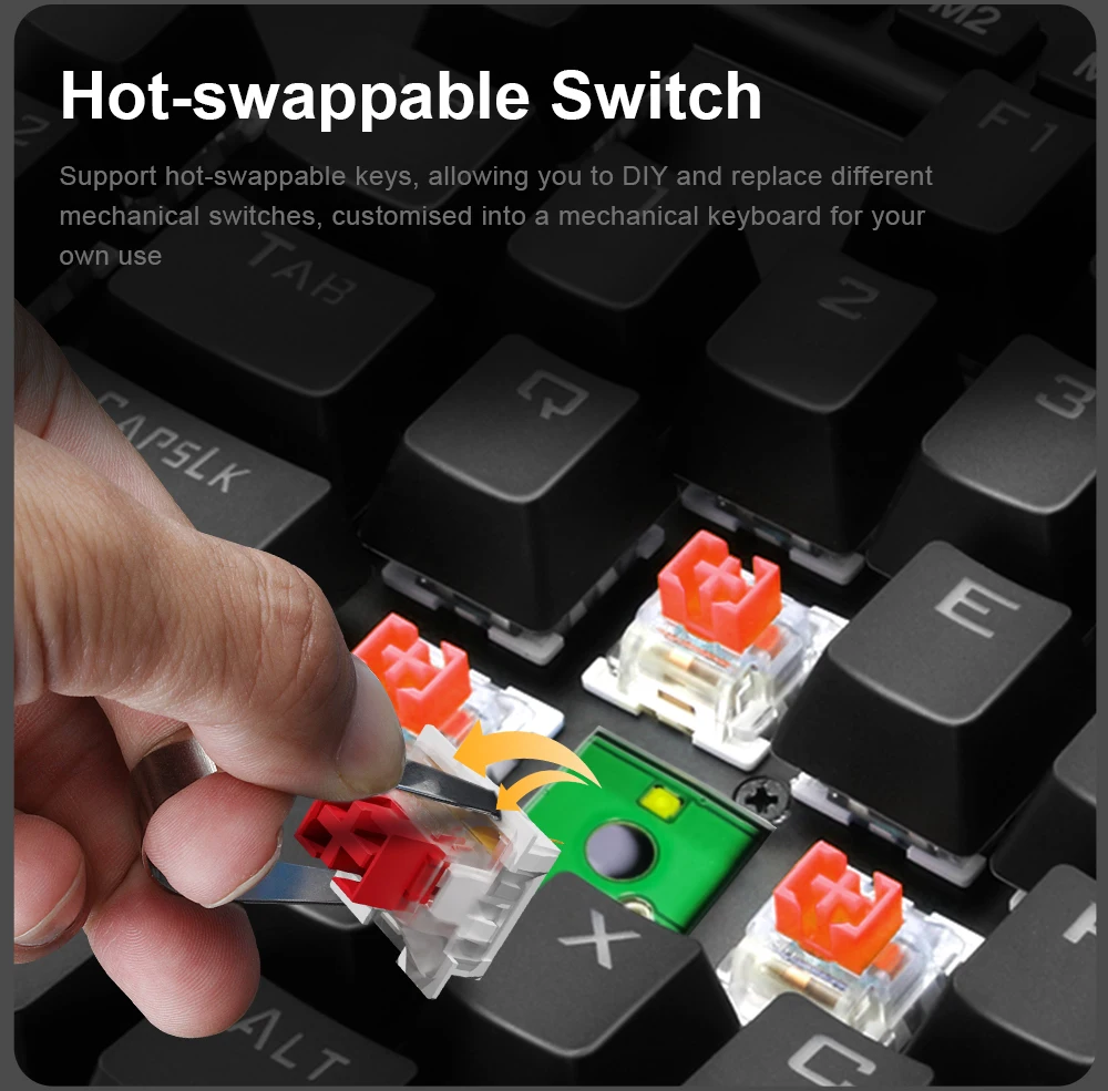 Hot-Swappable Red Switches: Most quiet mechanical switch, linear and soft key travel makes every click easy to register. Hot-swappable switches. Made to last with switches rated for 50 million keypresses.