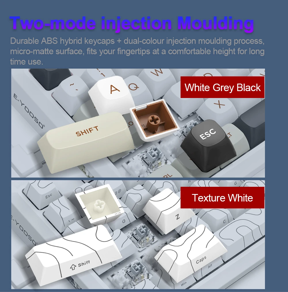 Hot-Swappable Switches: linear and soft key travel makes every click easy to register. Hot-swappable with other E-YOOSO switches. Made to last with switches rated for 50 million keypresses.