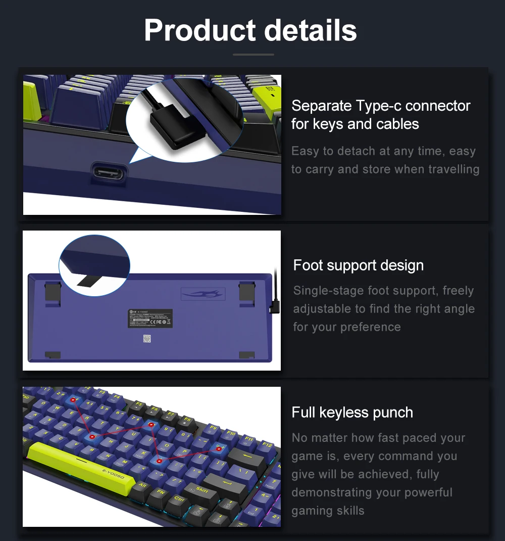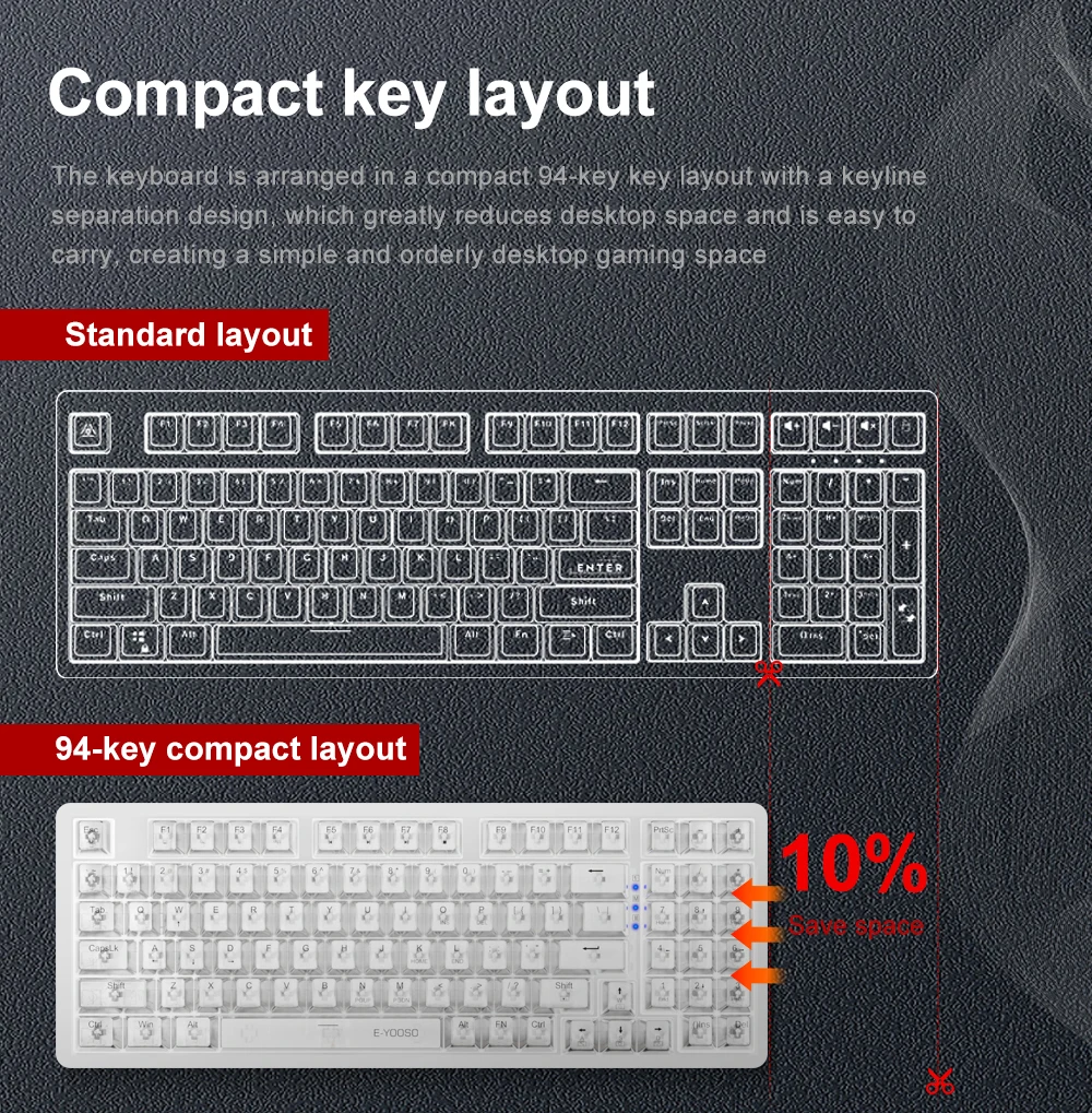 Compact Layout with 94 Keys- E-YOOSO Z-94 mechanical Keyboard keeps numeric pad and arrow keys, it will be much convenient for your work and games.