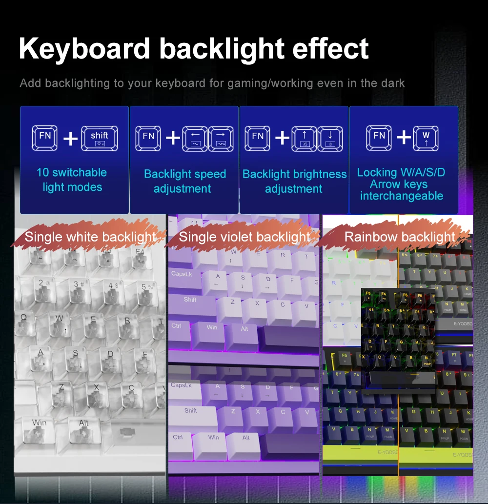 Monochrome LED Backlit Modes- backlit Modes can be adjusted through FN+Shift keys combination.The backlit modes can be customized easily without installing software, it is a great choice to DIY your stylish keyboard.