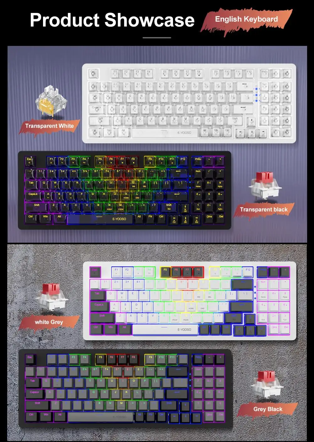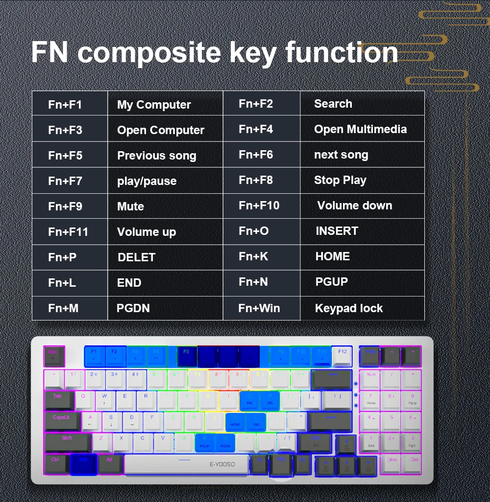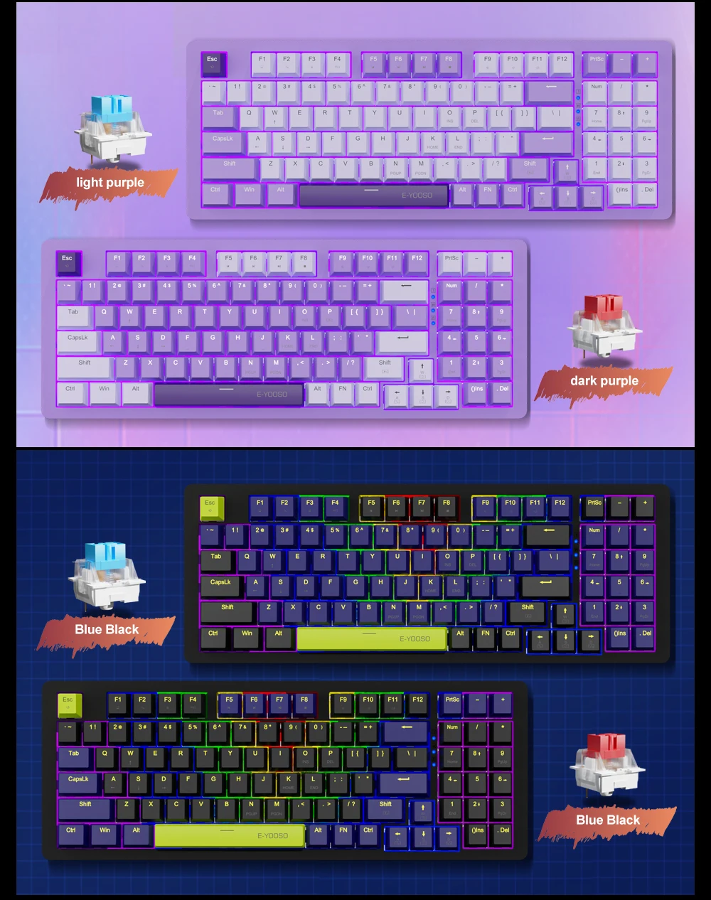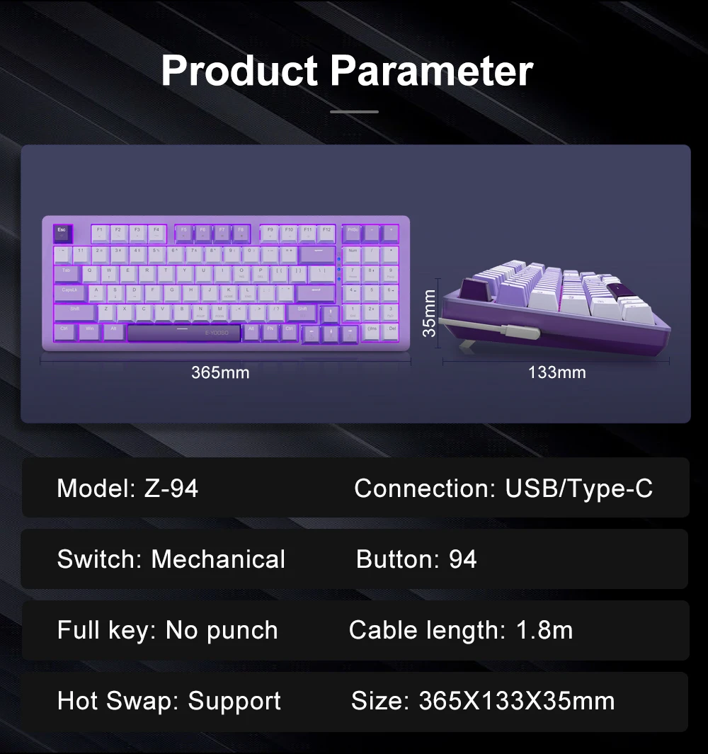 Practical Wired 94 Keys – E-YOOSO 85% layout Z94 in wired mode meets the user’s need for separate arrow keys and number keys.The 94-key layout provides the ultimate balance of compactness and 104-key functionality, allowing for the smoothest habit curve.