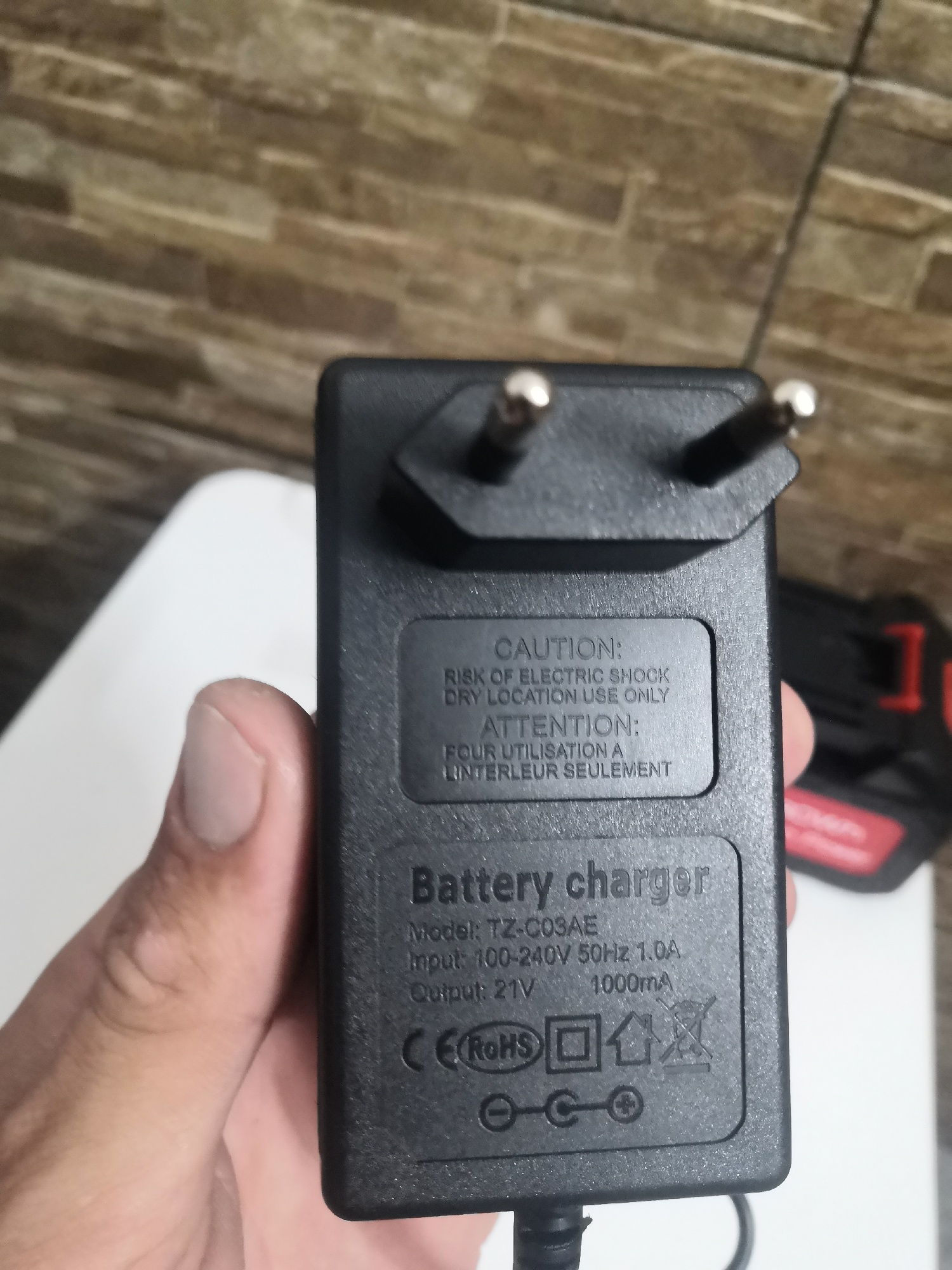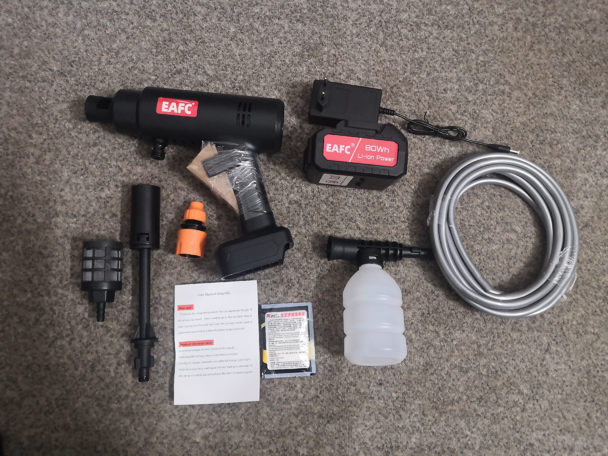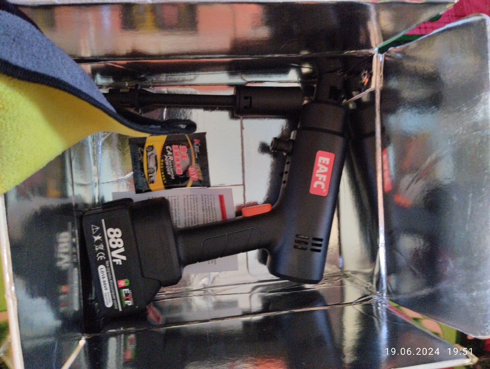 The battery is standard. Washing, foam makes, the pressure is excellent, the button is easy to press. As a gift shampoo and a microfiber cloth. Charger 1000mA. The feed hose is easily bent. The sink came in its box