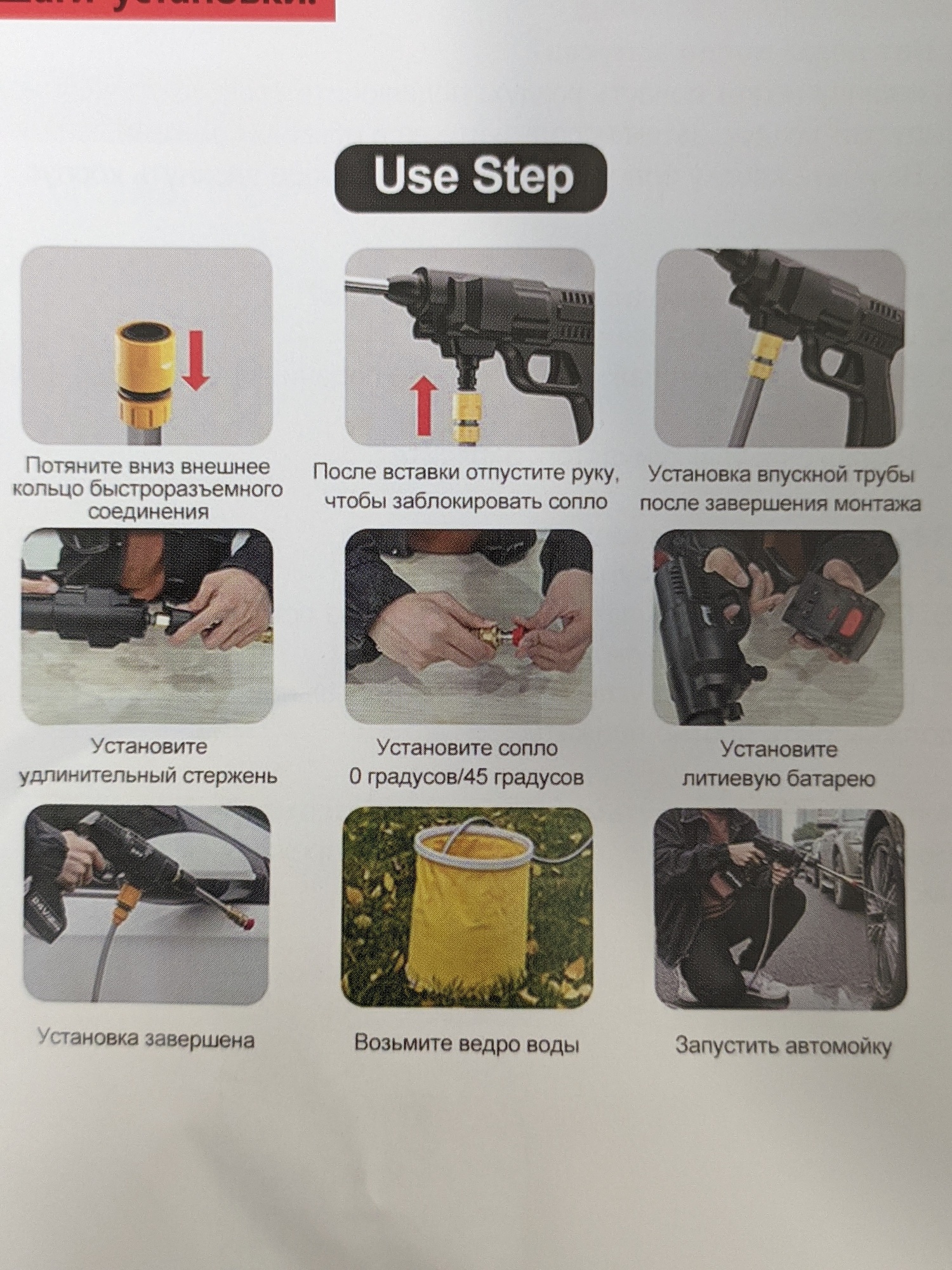 The goods arrived quickly and packed well. All whole, complete complete. Washing is made of high quality, looks stylish. There is an instruction in Russian. Immediately decided to try it out. The head is good, so is the jet adjustment. The gun in the hand is comfortable, the hand does not get tired. Washes well. My foam turned out not too thick, I wanted it not to drain longer. I think over time I will select the desired concentration or the shampoo itself, if I fail to buy a pennik separately. There are minor disadvantages: this is a Chinese plug on the charger, you need an adapter. And pop-up filter. I threw the nut inside it, maybe I'll leave it. In general, the purchase is very. A neighbor has already come running and he needs one) so I recommend it!