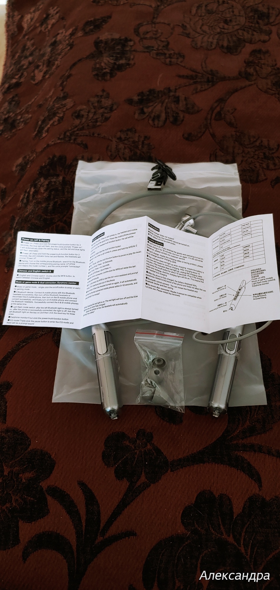 7 days from order to delivery, excellent service. Arrived undamaged and extremely well packaged. This is the second pair of these headphones I have bought. Sound quality is fine for my ears, full and rich with good bass. Voice instructions as delivered are in English, but simple to change if required. Simple but adequate manual. 8 hours use brings state of charge down to 88% so I figure that's about 66 hours of use without charging, excellent. (i.e. they would out last any long-haul flight even with stop over delays) Highly recommended.