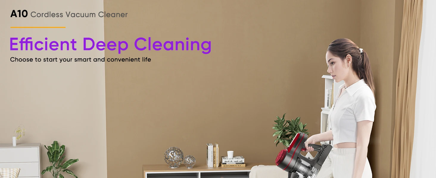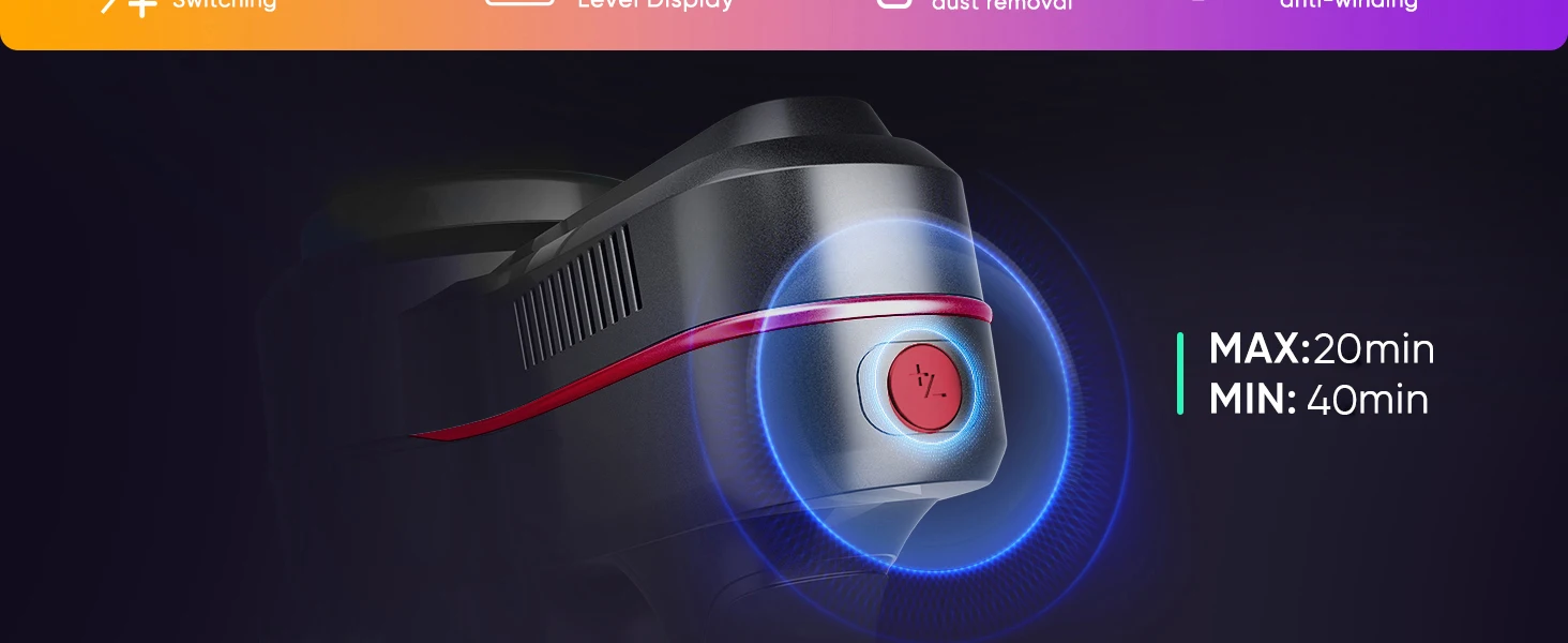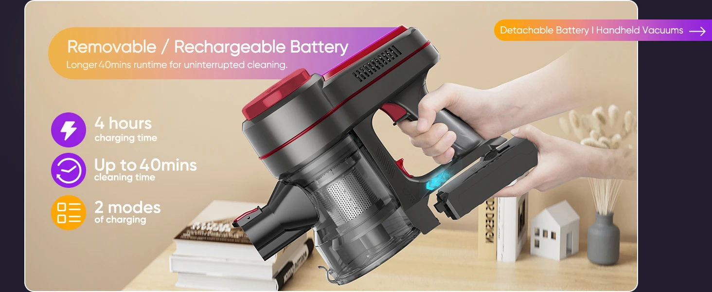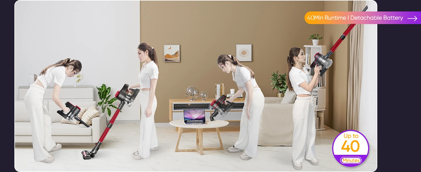 【40 Minutes Run Time & Replaceable Battery】The cordless vacuum cleaner is equipped with 6*2200mh battery, which provides 40 minutes of run time in ECO mode and 20 minutes of run time in TURBO mode. The one-touch battery swap design provides flexible charging options and long hours of uninterrupted cleaning, and performance can be restored by replacing the battery (sold separately).