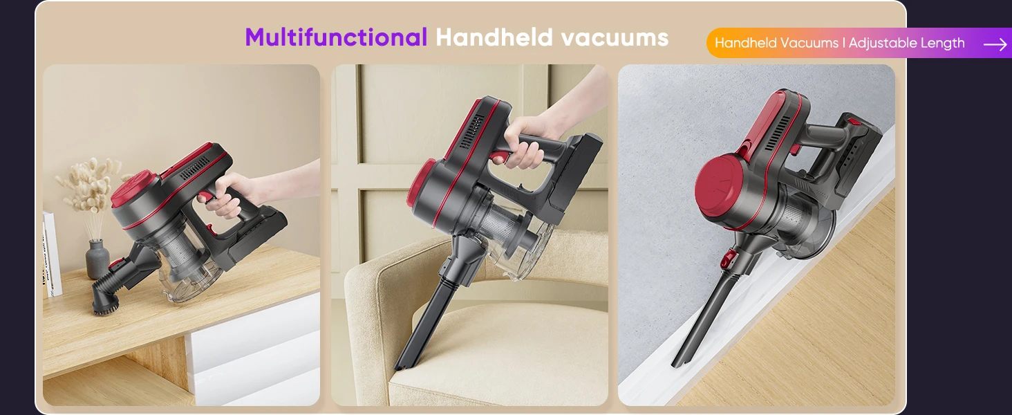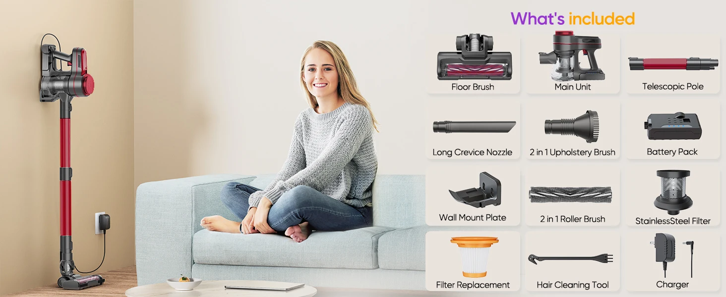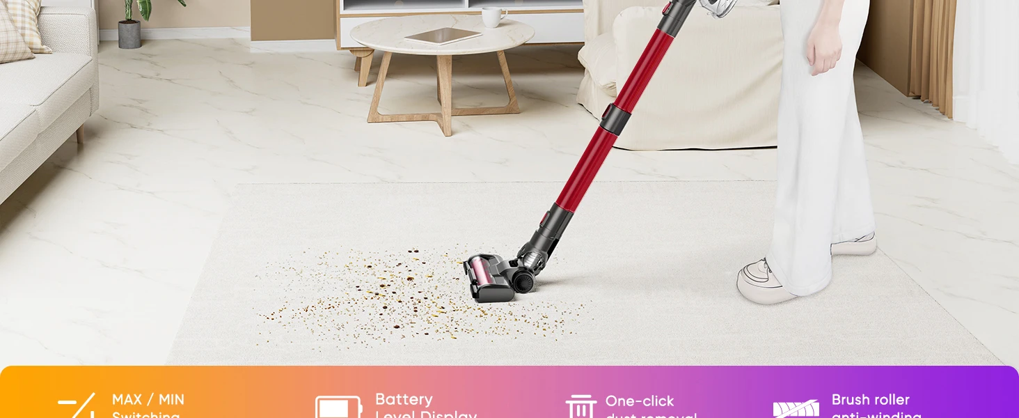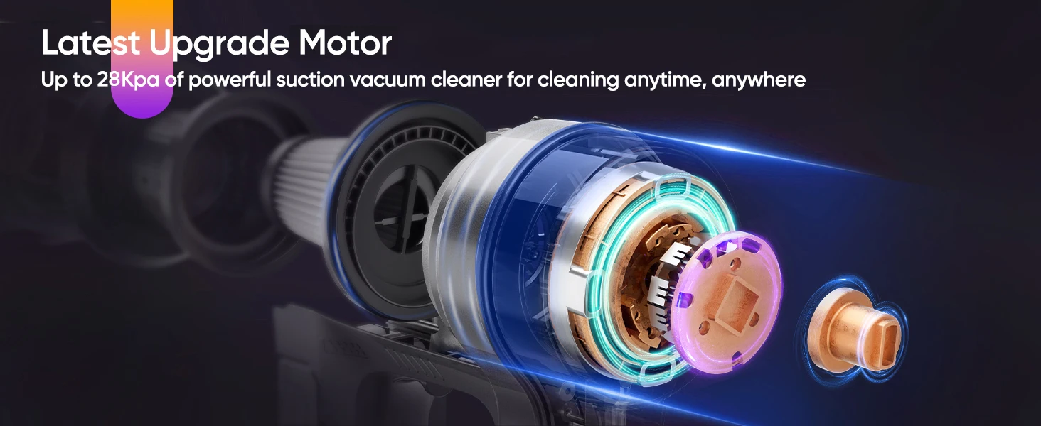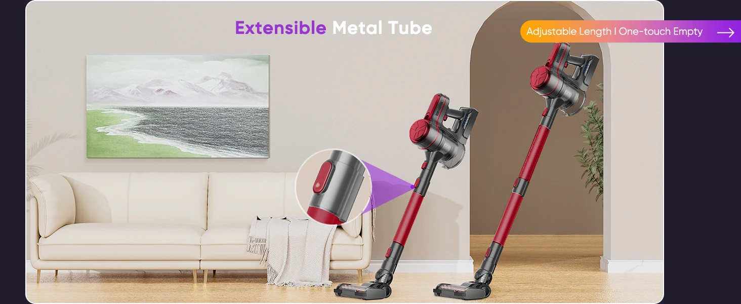 【Lightweight and Practical Design】The handheld vacuum cleaner body weighs only 1.46 kg, and the stick vacuum cleaner with a 12-level telescopic pole can be adjusted to the correct height. 2 adjustable suction levels of 12Kpa and 28Kpa can not only meet your daily cleaning needs, but also maximize battery performance. With the help of wall accessories, the vacuum cleaner can be stored rationally and space-savingly.