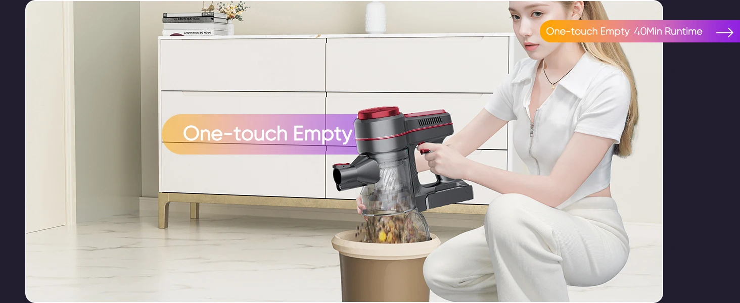【5-Level Efficient Filtration System】The cordless vacuum cleaner has a washable HEPA and 5-stage cyclone filtration system that can filter 99.97% of dust to 0.3µm. Featuring a large 1.5L container with a unique push-button design, you can clean with the push of a button without getting your hands dirty. There is no need to empty the container multiple times when cleaning.