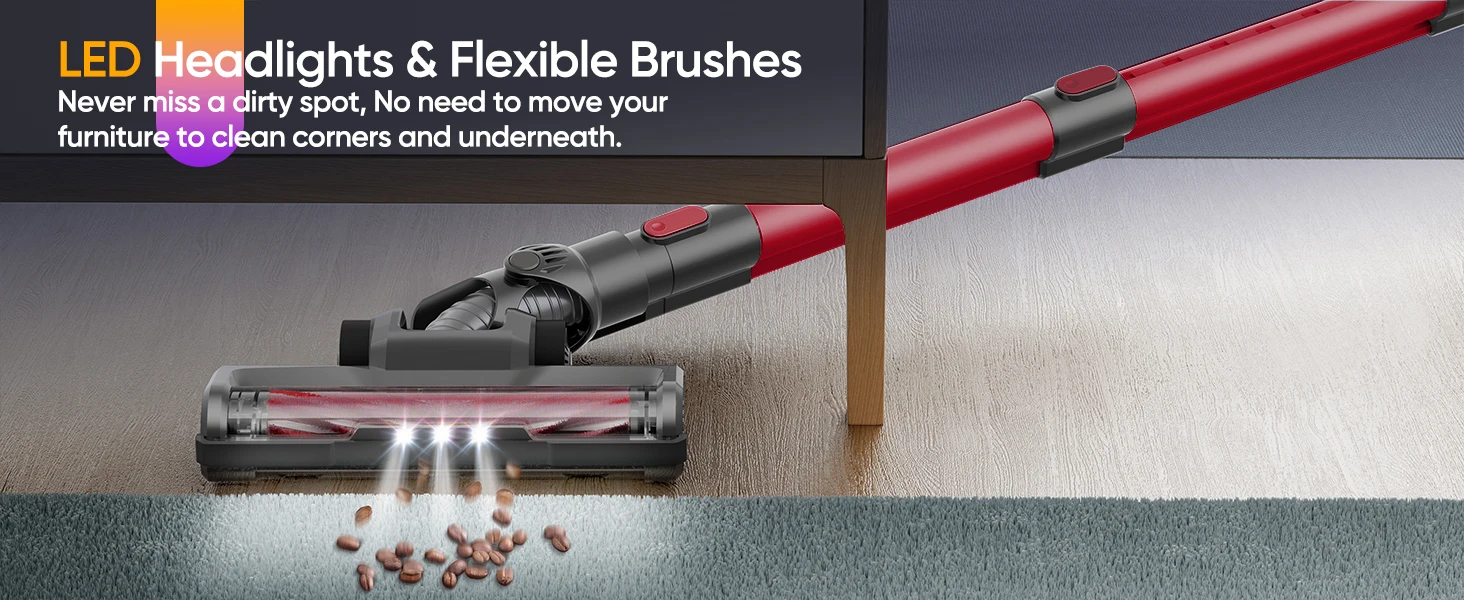 【LED Light and Rotating Floor Brush】The floor brush can rotate 180° left and right and 90° up and down, allowing the vacuum cleaner to easily clean dirt under the bed and sofa furniture. The floor brush also features 3 LED lights so you can spot hidden dirt in dark corners and crevices for improved cleaning performance.