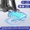 【40 Long-Lasting Runtime】The cordless stick vacuum cleaner is equipped with a 6*2200mAh Li-ion battery in Eco mode (40 minutes) and Turbo (20 minutes). Plus, it disassembles for easy recharging and battery replacement, and it takes just 4 hours to fully charge, providing reliable performance for cleaning jobs.