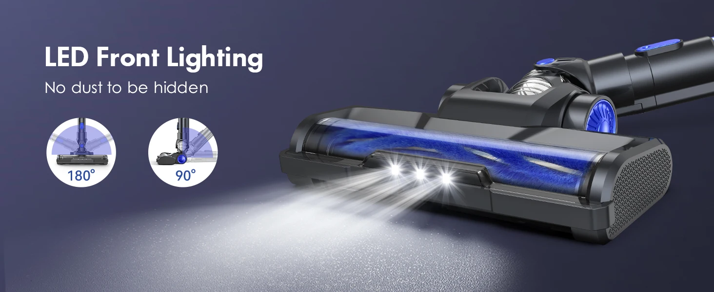 The battery-powered vacuum cleaner with 3 LED lights can be moved from side to side at any angle, making it easy to clean even under beds and sofas.