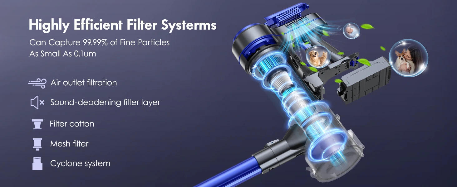 【Efficient and Convenient Filtration System】The stick cordless vacuum cleaner is equipped with an ultra-fine mesh HEPA filter, which can effectively filter 99.9% to 0.3μm particles to protect the motor and ensure cleanliness. The HEPA of vacuum cleaner is washable.
