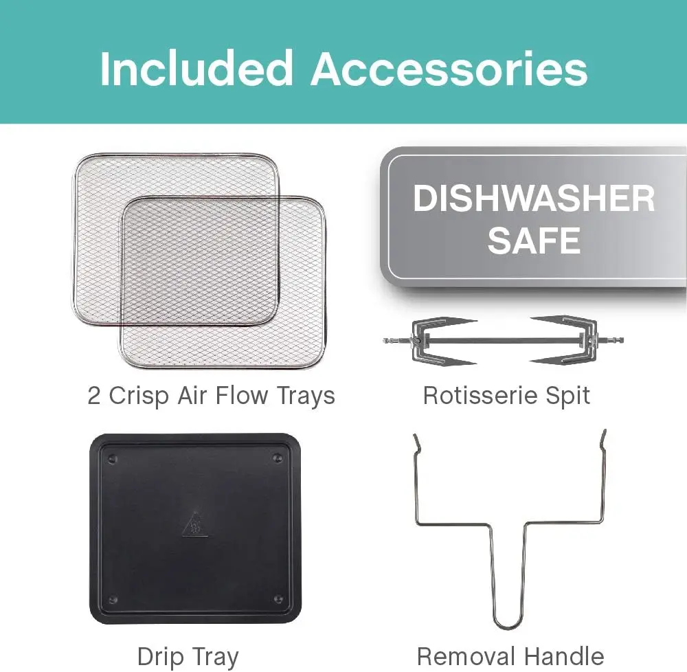 - Cyclonic Crisping Technology: This air fry oven power crisps your food by circulating hot air at high speeds