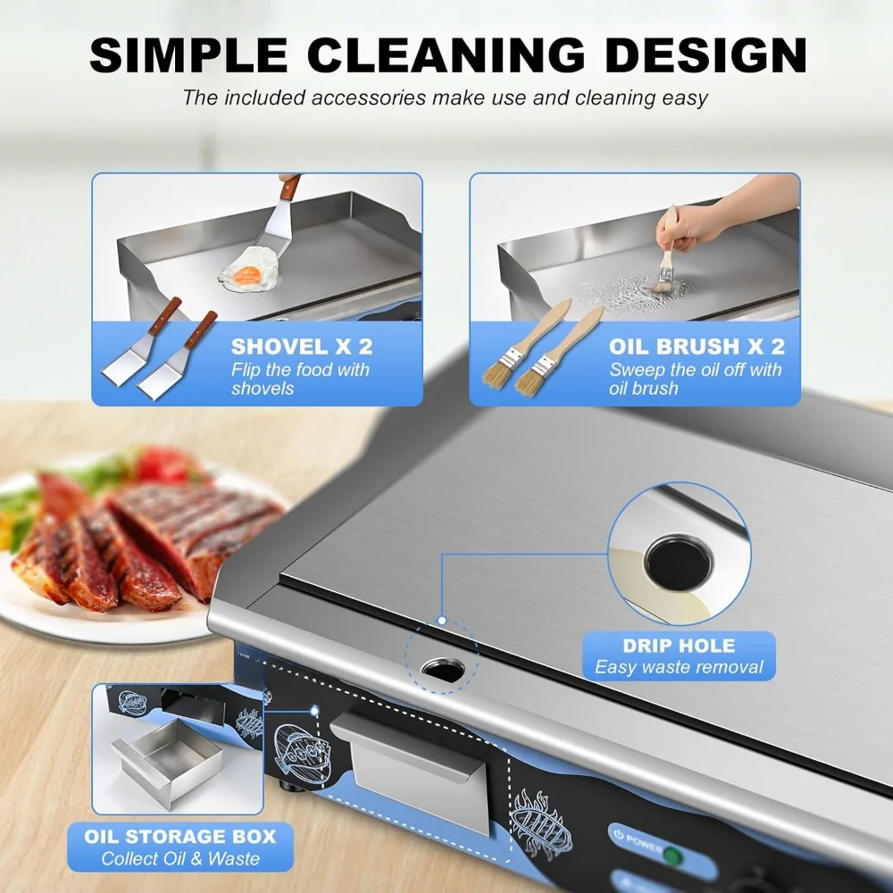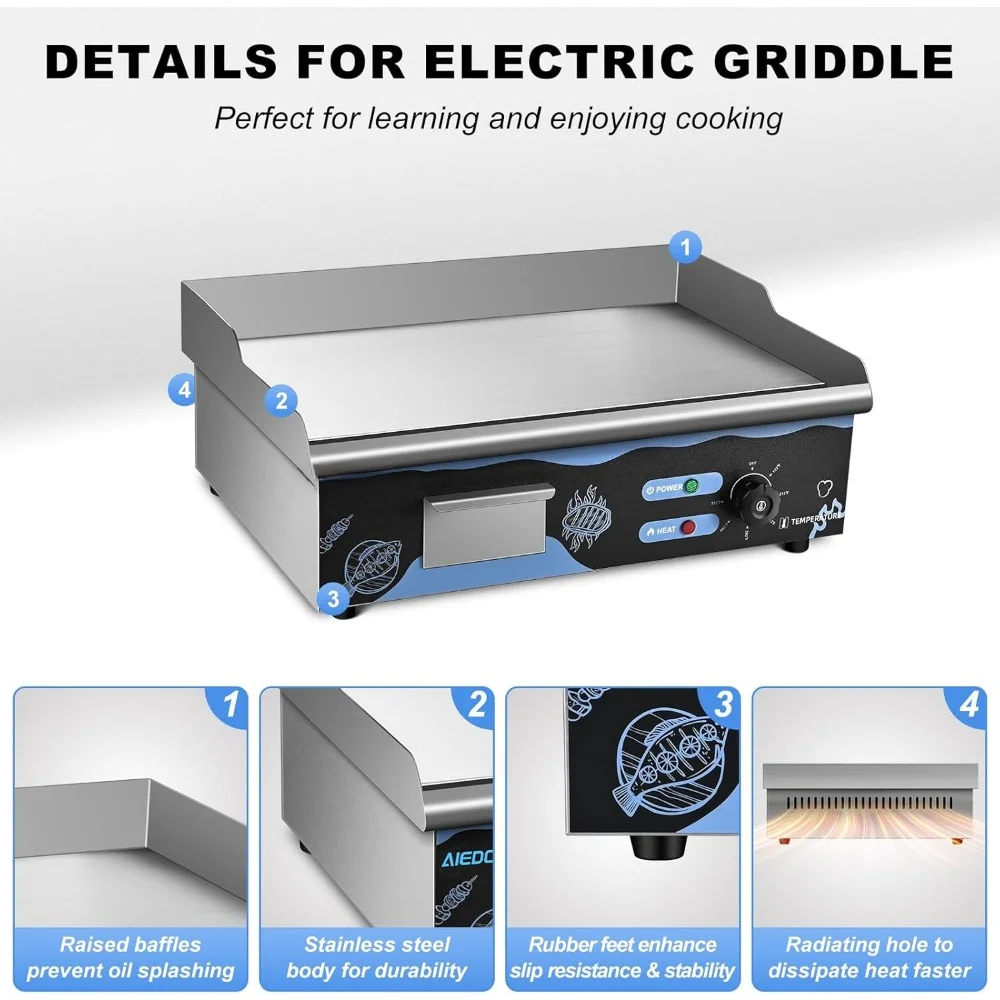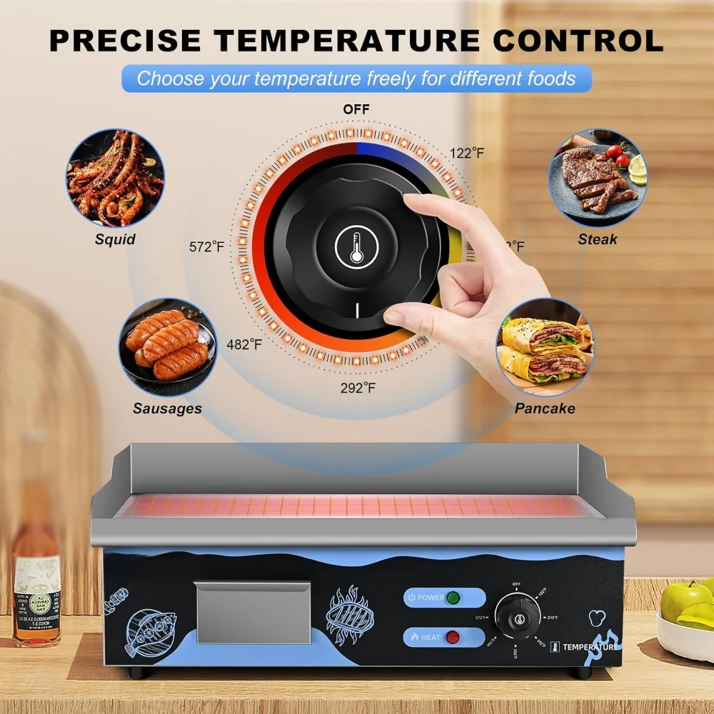 - Wide Compatibility – This electric grill is suitable for home use or commercial use in kitchens, restaurants, roadside stands, snack bars, etc.; whether you want to cook fried steak, pancakes, bacon, eggs, or other food, this grill can satisfy you.