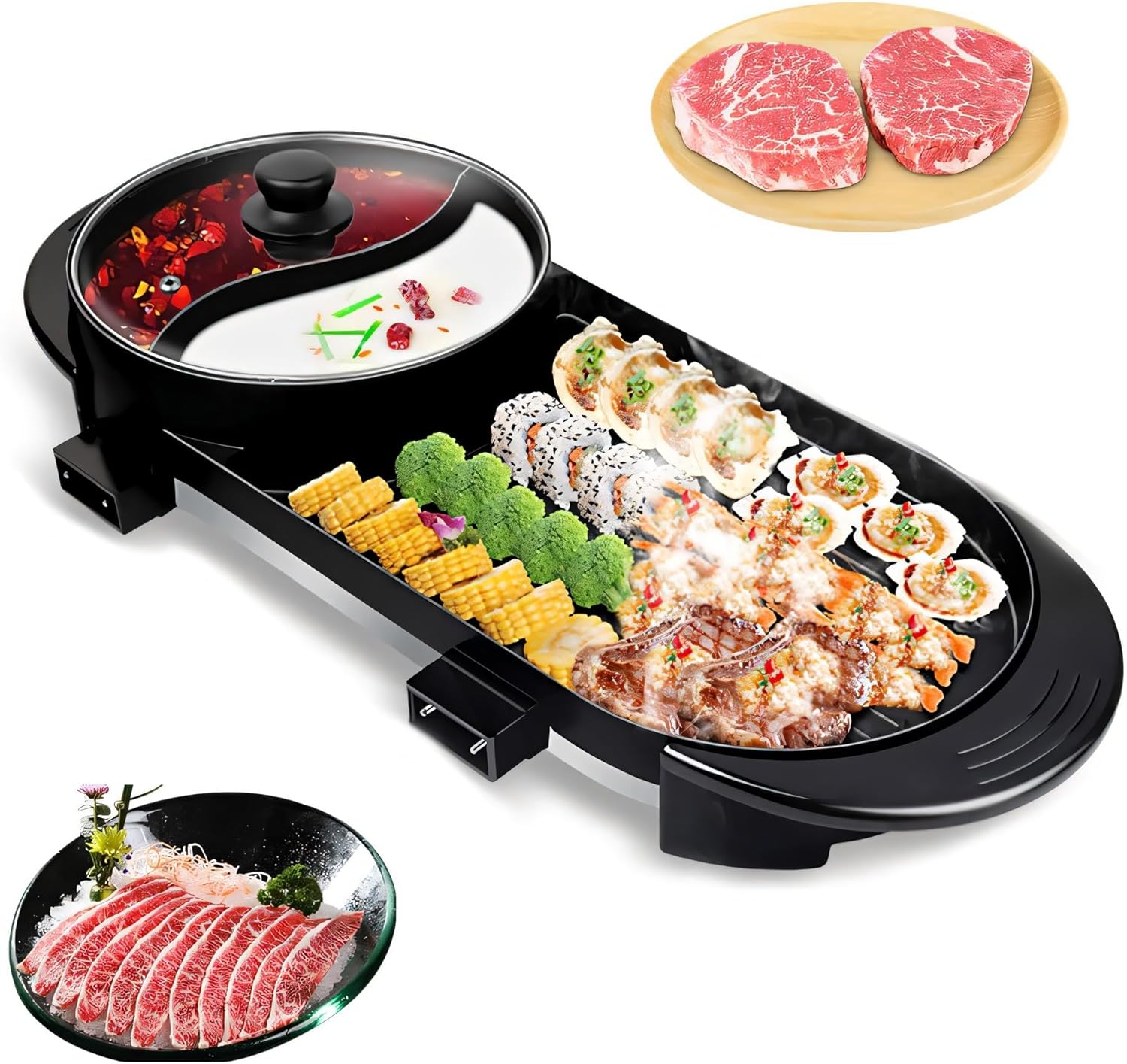 Hot Pot with Grill 2 in 1 Indoor 1500W Smokeless Large Capacity Electric Non Stick BBQ Grill Shabu