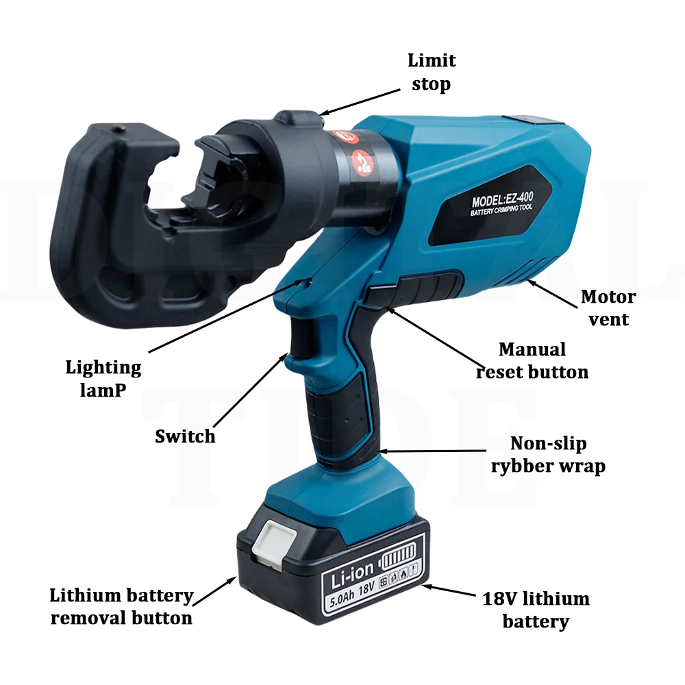 EZ-300/400 adopts high-performance anal battery power supply, motor drive, microcomputer (MCU) control, ultra-high pressure hydraulic system and other mechatronics technologies. It integrates ergonomic design and has beautiful appearance, easy operation and large output force. , Super safety, high work efficiency, is one of your tools for crimping wires and copper/aluminum terminals in power and lighting power construction.