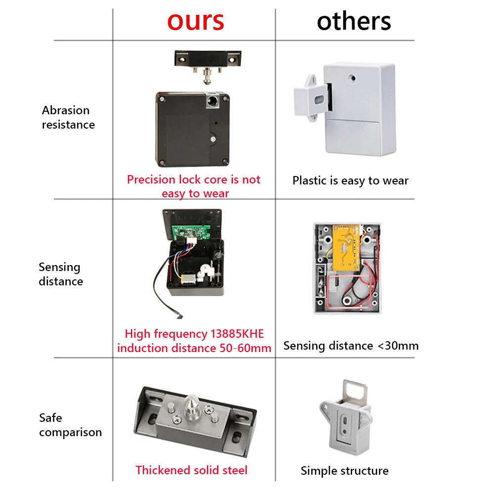 Feature: Metal lock cylinder. Protect valuables, safe and secure. and anti-corrosion. The 8.5mm thick solid stainless steel bolt has a safety factor comparable to a safe. Swipe to unlock/Tongtong Lock APP+IC induction swipe to unlock, remote sensing. Adapt to 99% of cabinet doors, drawers, mechanical automatic rebound, sensing distance 40-60mm. Low energy consumption design. Energy-saving technology is newly upgraded with low-loss energy-saving chips, and the replacement cycle of dry batteries is expected to be used for 1-2 years. Invisible installation is free of punching. After the installation is completed, it will not affect the appearance, nor will it damage your cabinet. Support the emergency external power supply to unlock the power supply when the battery is dead. Optional external power supply (need to make small holes). This model is only suitable for wooden doors and is widely used in drawers, storage cabinets, cabinets, sliding doors, etc. Specification: Introduce: Note:
