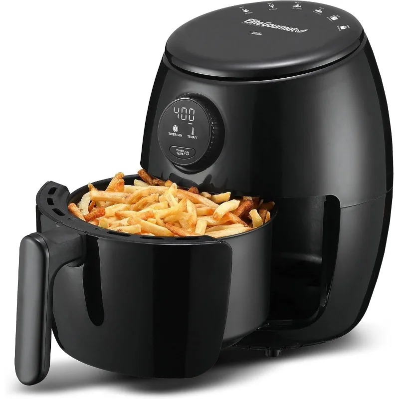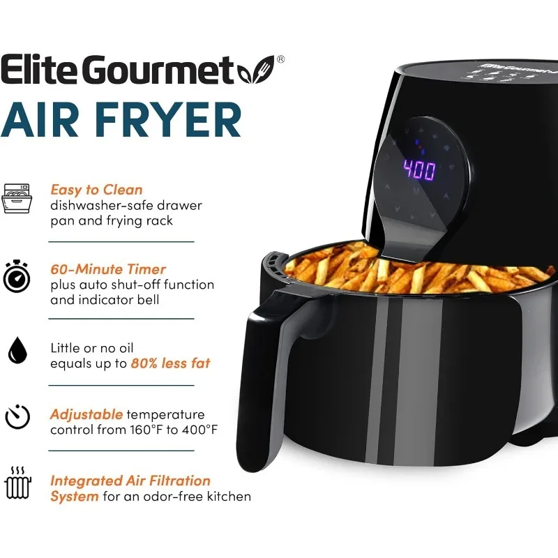 - PRESET FUNCTIONS AND PROGRAMMABLE TIMER AND TEMPERATURE settings give you the ultimate in cooking control and versatility allowing you to bake pizza, air fry french fries, bake shrimp, fish & chicken, grill meats and steam vegetables with the touch of a button! A high-power convection fan envelops food in temperatures from 180 to 400F degrees and a 60-minute timer automatically shuts off the Elite Gourmet Air Fryer at the end of the cooking cycle