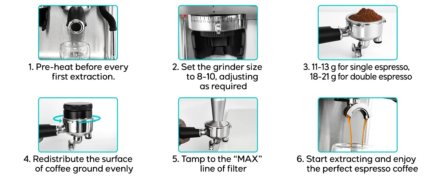 We have prepared many accessories, such as replacement grinder, 58mm portafilter, one cup filter, two cup filter, tamper, coffee distributor, tamper mat, milk frothing pitcher, spoon for ground coffee, cleaning needle, cleaning brush, coffee art pen