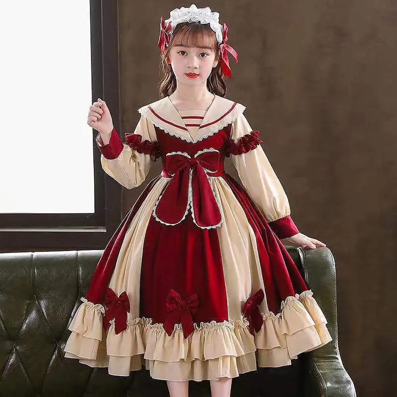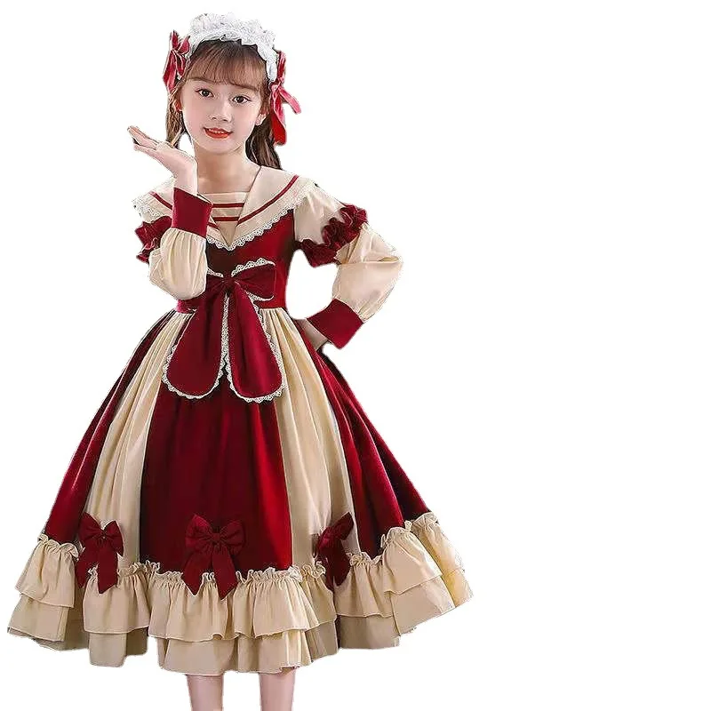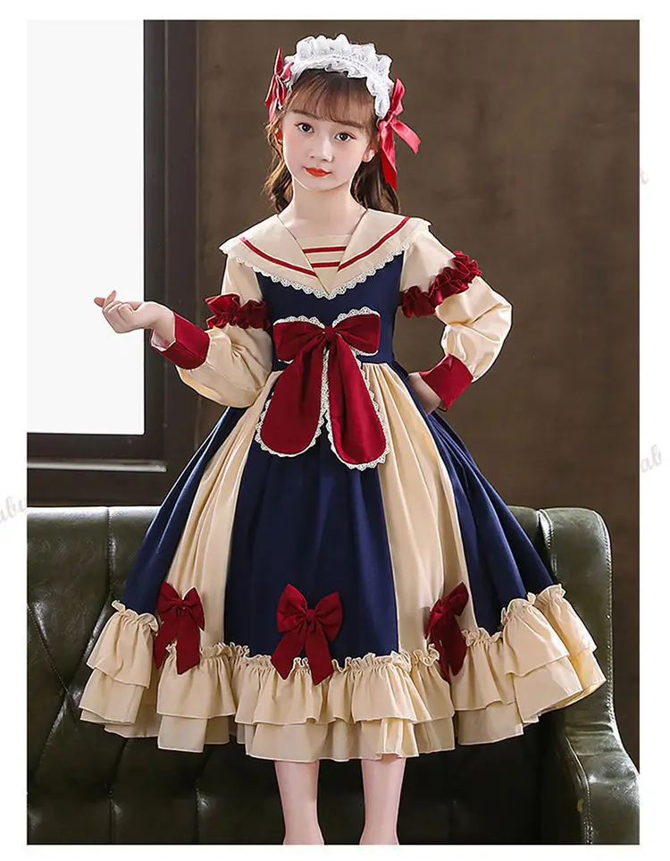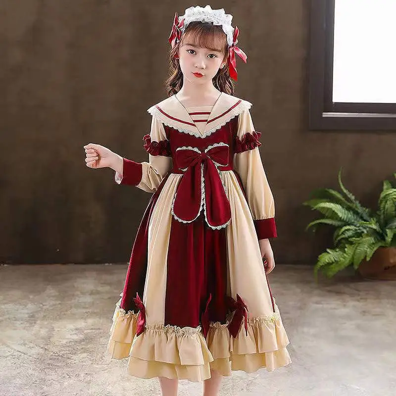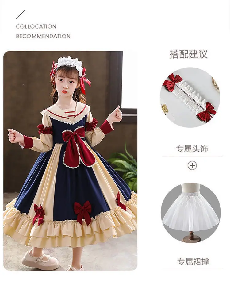 European 2026 spring Autumn girls Clothes retro teens lace Lolita bowtie uniform Child Princess Puffy Dress 5 6 7 8 9 10 12 year