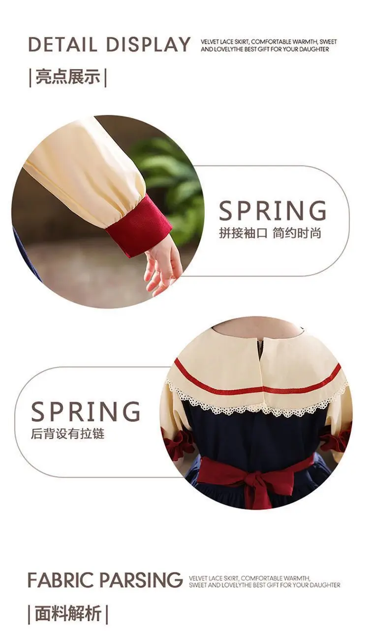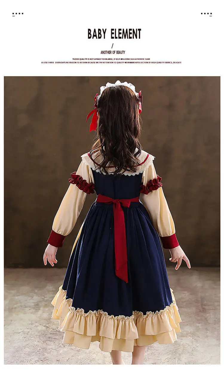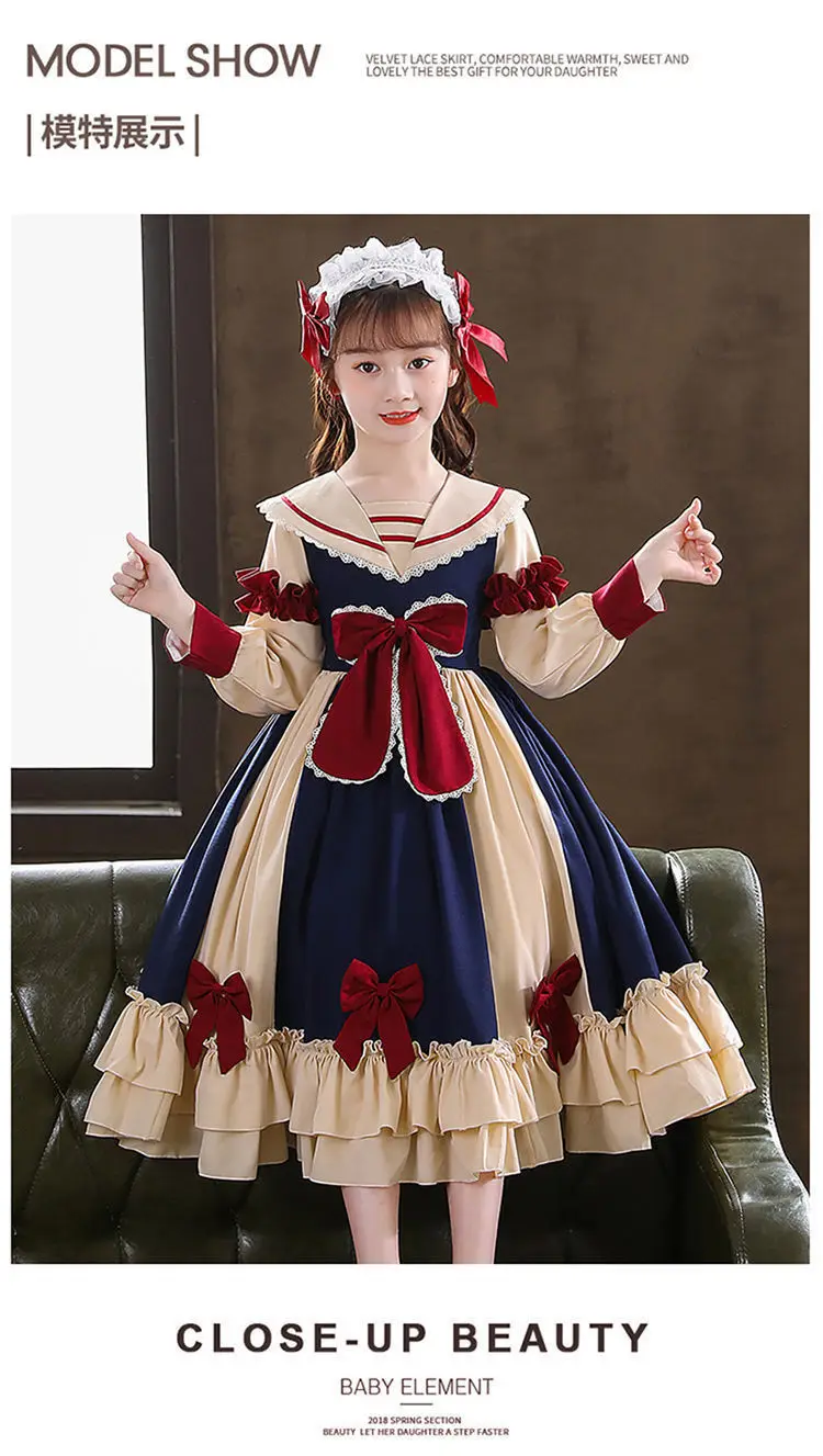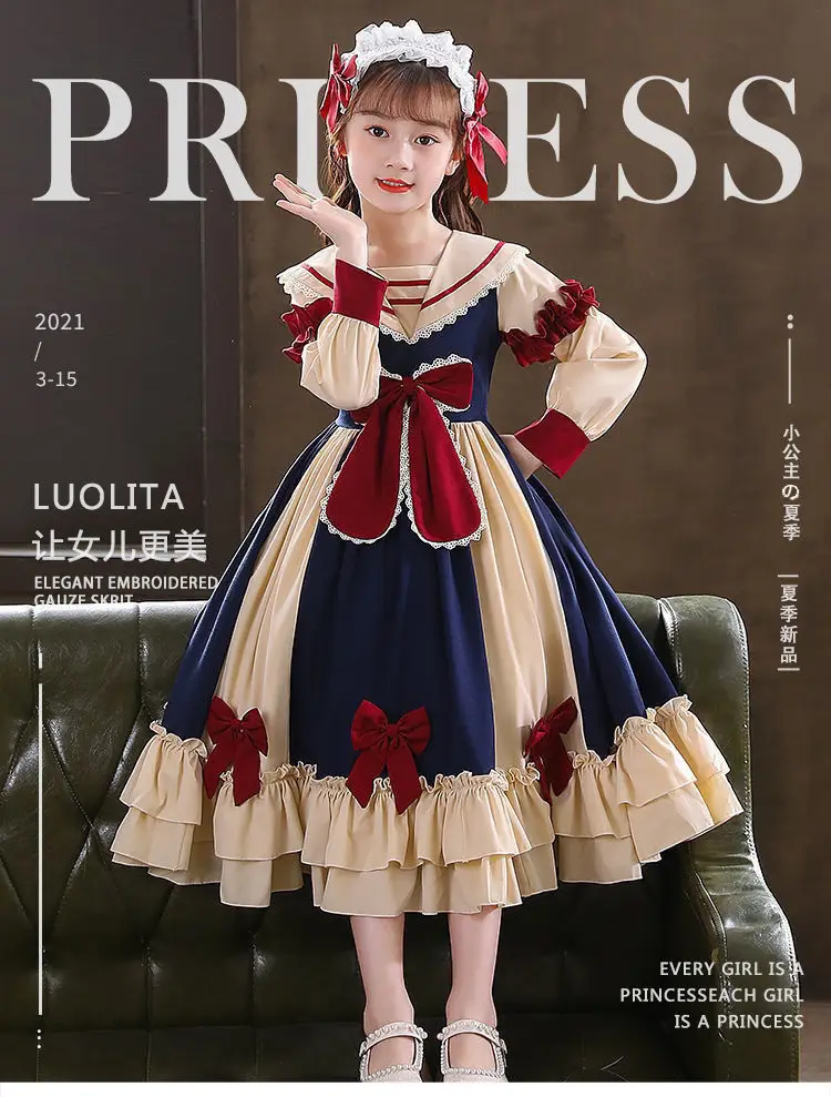 European 2026 spring Autumn girls Clothes retro teens lace Lolita bowtie uniform Child Princess Puffy Dress 5 6 7 8 9 10 12 year