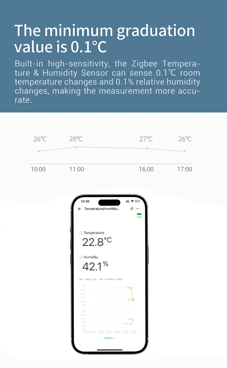 Real-time perception of temperature and humidity changes and real-time report to your smart phones with eWeLink App supported. View history record in App for smart controls for your house temperature and humidity. Monitor your house temperature and humidity no matter where you are.