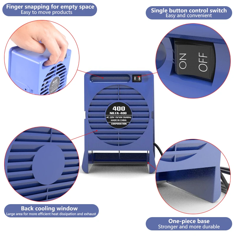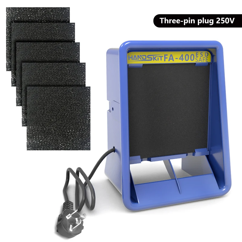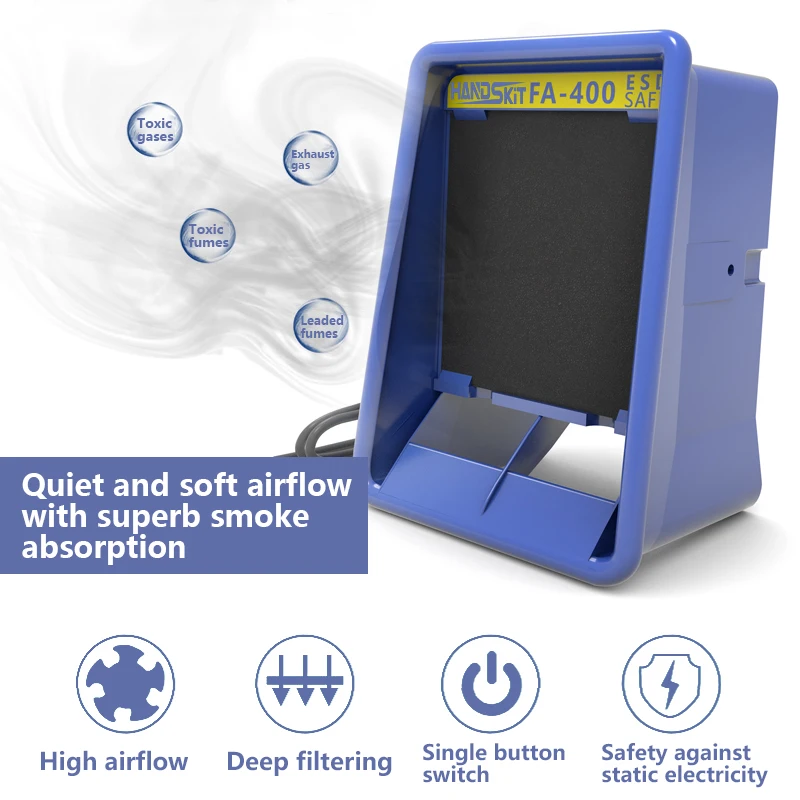 Breathe easy with the FA-400 bench top smoke absorber. The FA-400 removes soldering smoke and fumes quickly, safely and efficiently. The unit can be used in a vertical (standing up) position or low-profile position (laying down.) When used in the low-profile (laying down) position, efficiency and air flow is increased by approximately 2.6 times.