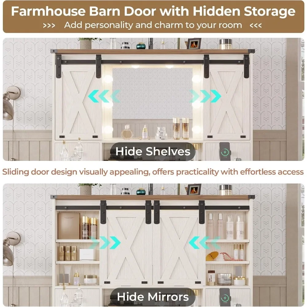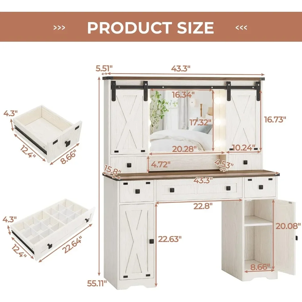 【Powerful Storage Capacity】Large dresser comes with enough capacity storage. The spacious tabletop and hidden storage shelves behind sliding barn door are enough to hold your frequently used makeup items, making your desktop more clean and tidy. The dressing table has 5 drawers and 2 side cabinets, which are perfectly able to hold all your other stuff. Keep everything organized and within reach.