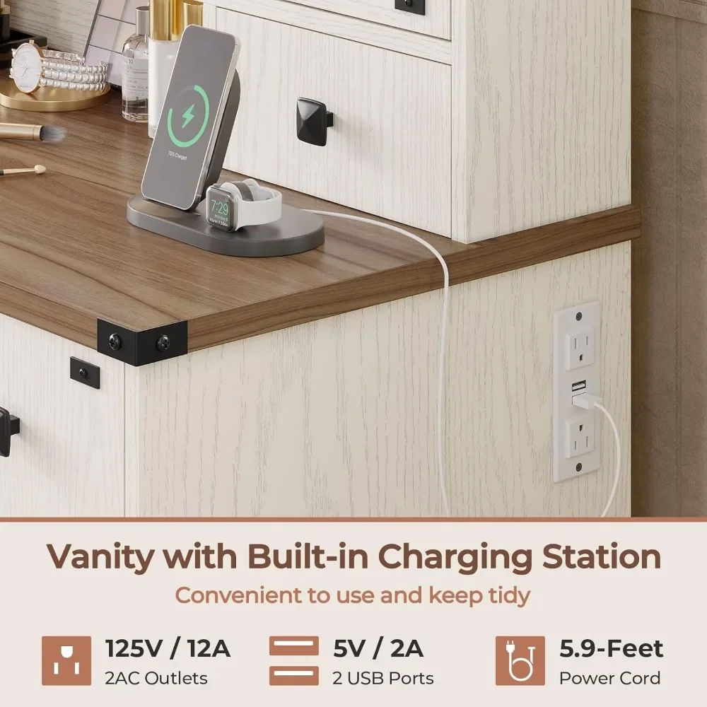 【Hook up Your Devices】This vanity with charging station is equipped with 2 standard plug sockets and 2 USB ports, allowing you to use your hair dryer or curling iron more conveniently while applying make-up, as well as charging your cell phone, tablet, or other electronic devices. In this space that belongs to you, relax and listen to music, watch tutorials and share a photo or video.