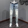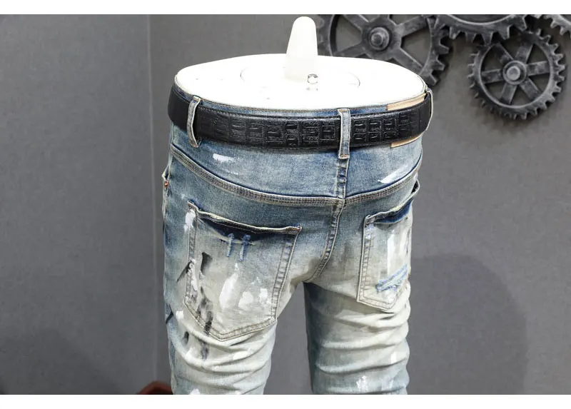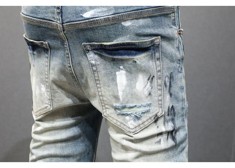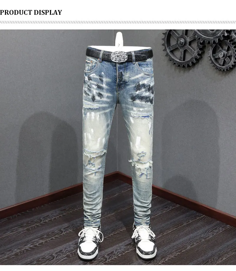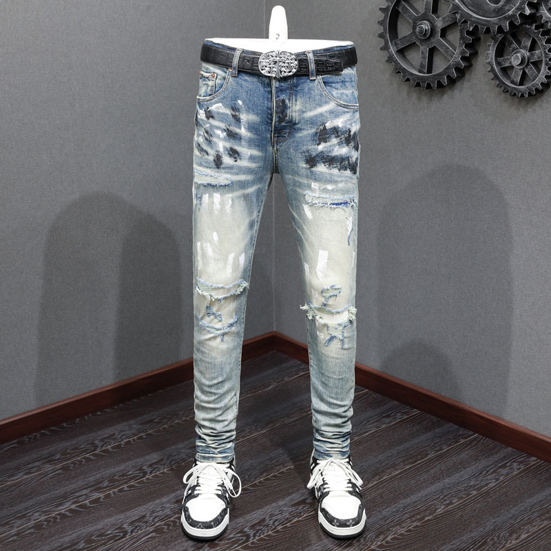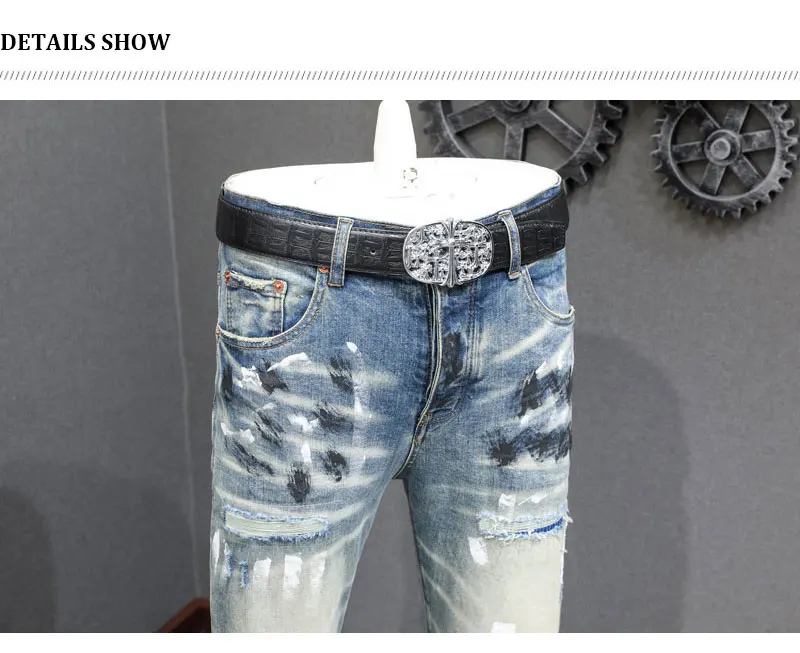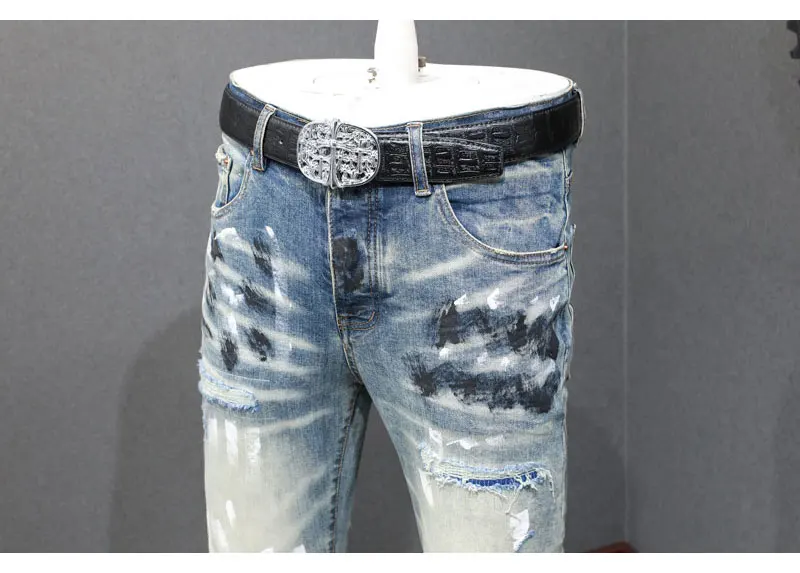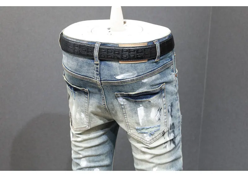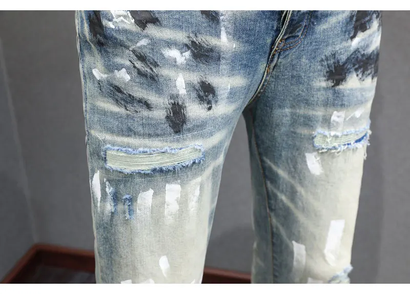 Fashionable new men’s jeans stretch slim fit painted wash blue high street hip-hop brand pants hombre