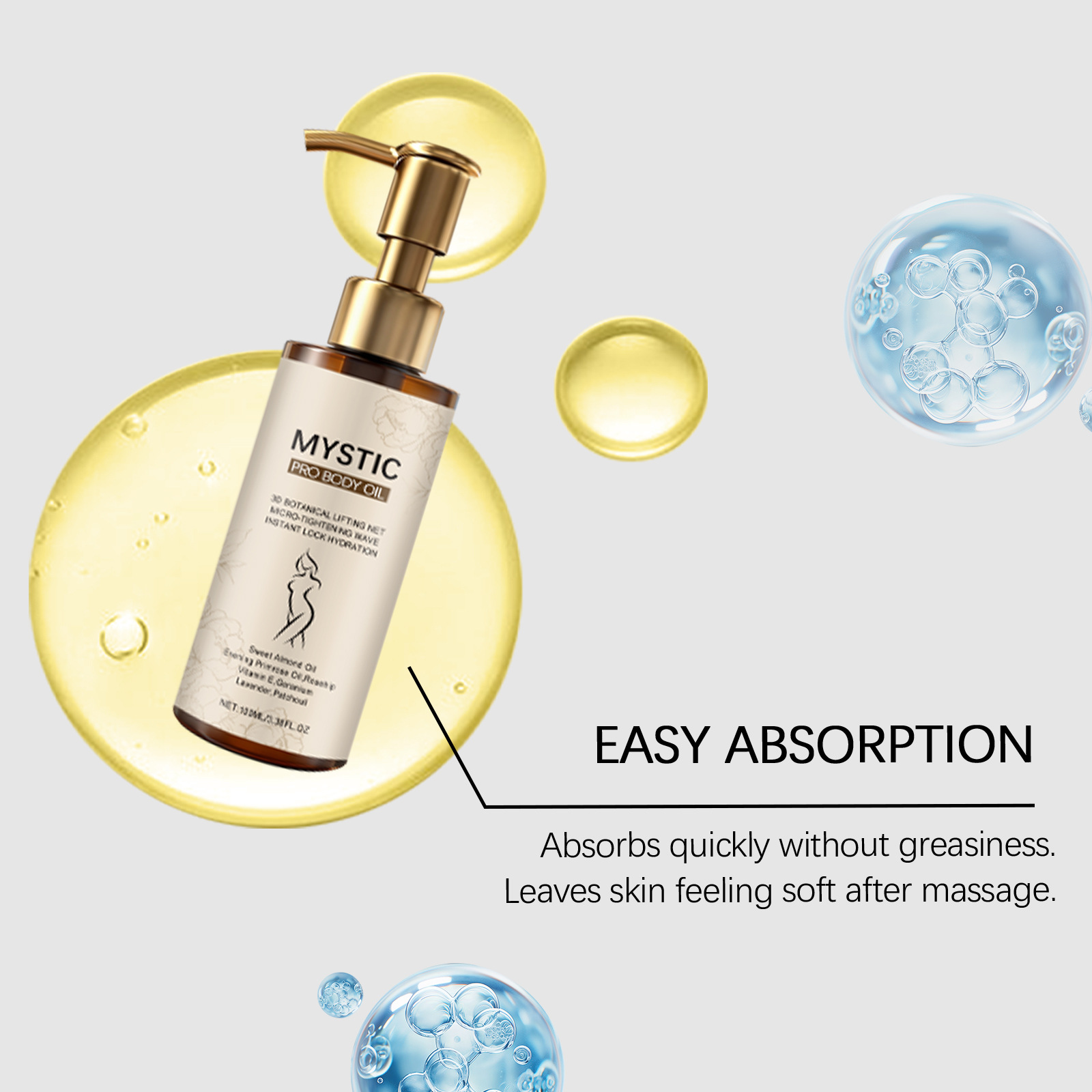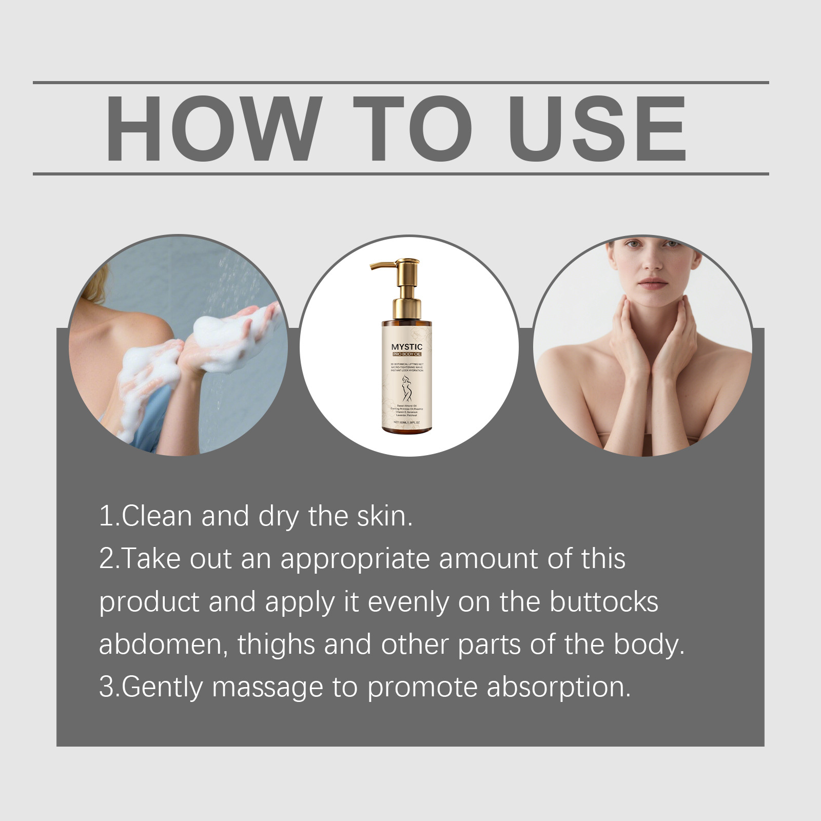 1. Our body care oil helps tighten the skin and supplements post shower care steps. Full body use, suitable for all body parts, helps improve the overall texture of the skin. Focused on moisturizing and firming the skin, easy to absorb, without greasy residue. Gentle and suitable for daily skin use. Suitable for arms, legs, and abdomen, massage to make the skin feel soft.