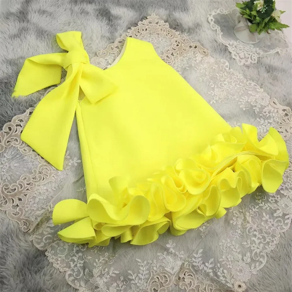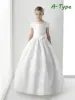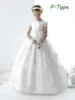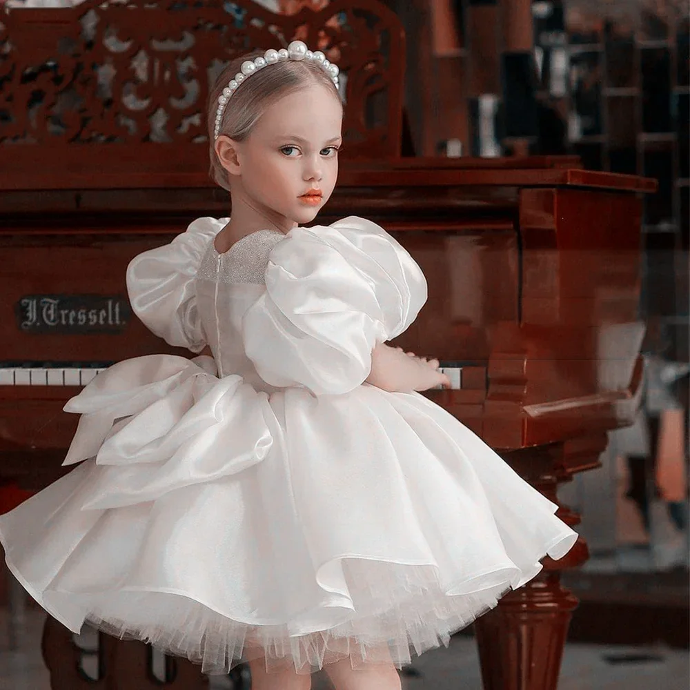 First Communion Gowns White Satin Flower Girl Dress Short sleeves With Bow Little Princess Kids Birthday Evening Pageant Dresses