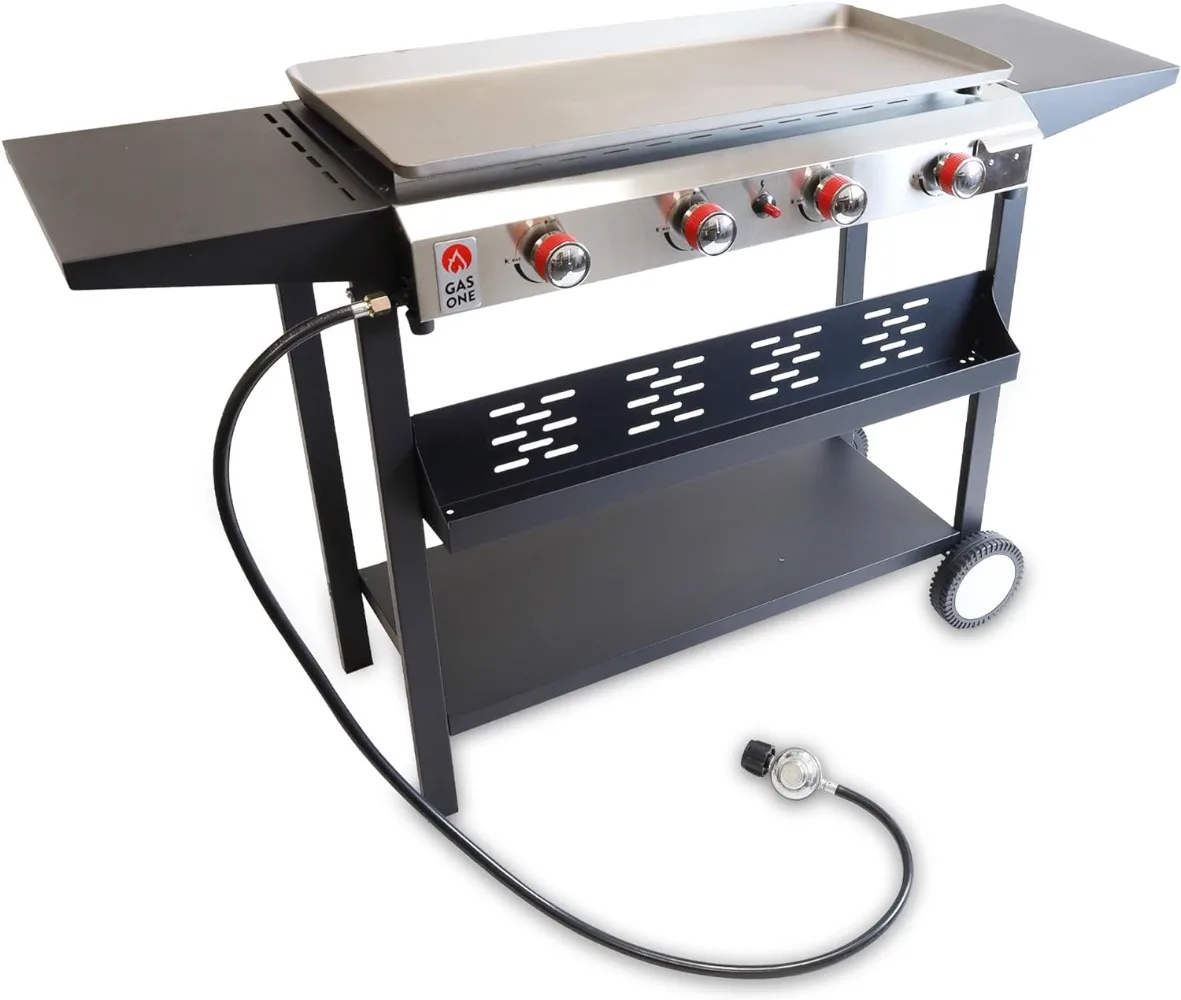 - Intelligent Auto Ignition Feature: Our bbq grill propane has a smart auto ignition function, being easy to use and install even for first timers. The kit includes the gas stove, propane regulator, hose assembly, griddle and cart, for a full and reliable outdoor cooking experience!
