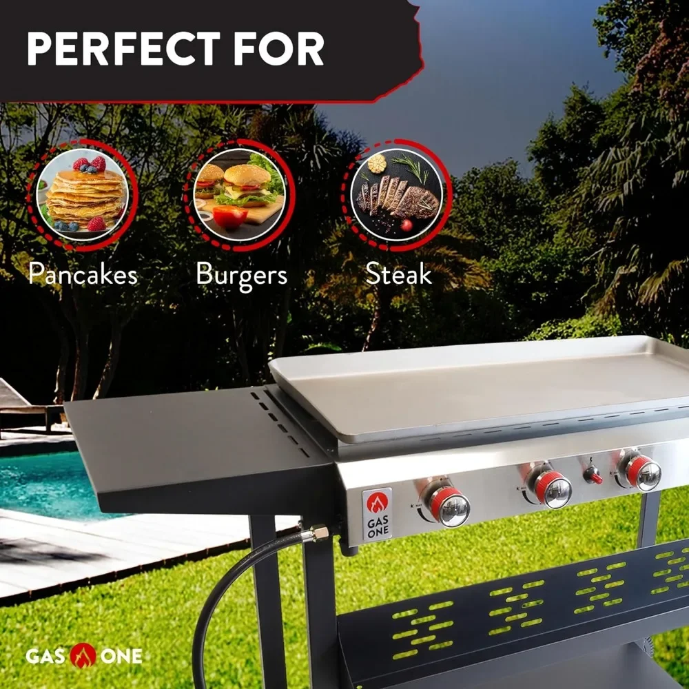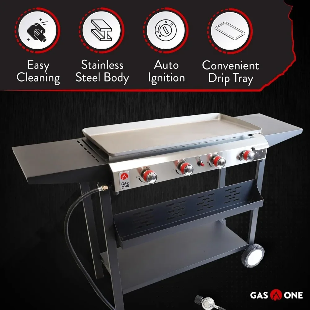 - Intelligent Auto Ignition Feature: Our bbq grill propane has a smart auto ignition function, being easy to use and install even for first timers. The kit includes the gas stove, propane regulator, hose assembly, griddle and cart, for a full and reliable outdoor cooking experience!