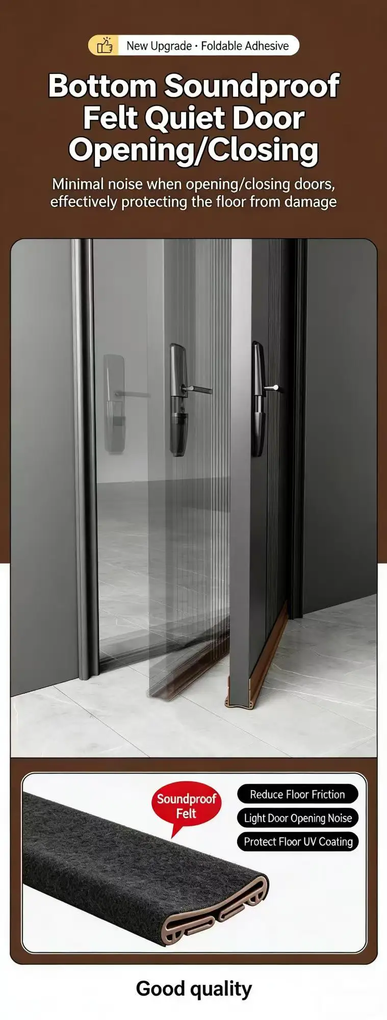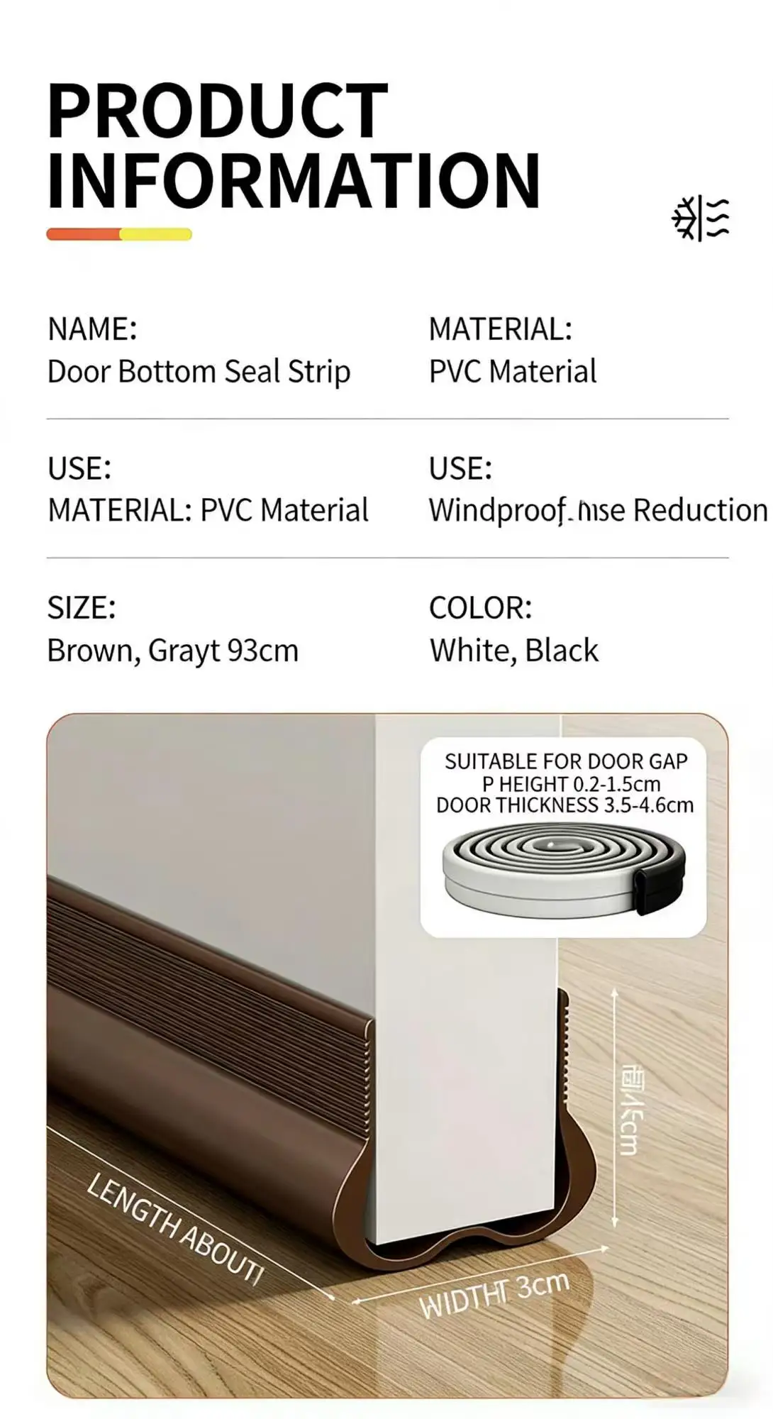 The strip can be easily trimmed to the exact length required for any door, ensuring a perfect fit without the need for additional tools or professional assistance.10.Universal Compatibility.Designed to fit a wide range of door types, including swing doors, sliding doors, patio doors, and garage doors, providing versatile application across different settings.11.Floor Protection.By preventing water and moisture from seeping onto the floor, the strip helps protect flooring materials (like hardwood or laminate) from warping, swelling, or staining.12.Enhanced Security.Sealing the door gap also adds a layer of security by making it more difficult for potential intruders to force the door open or manipulate the gap.13.Extended Door Sweep Lifespan.By reducing direct exposure to moisture and debris, the strip helps prolong the life of existing door sweeps and other hardware.14.Low VOC Emissions.The manufacturing process adheres to low volatile organic compound (VOC) standards, ensuring that the product does not release harmful gases into the indoor environment.15.ISO 9001 Certified Quality.Produced under strict ISO 9001 quality management systems, guaranteeing consistent performance, reliability, and adherence to international standards. -